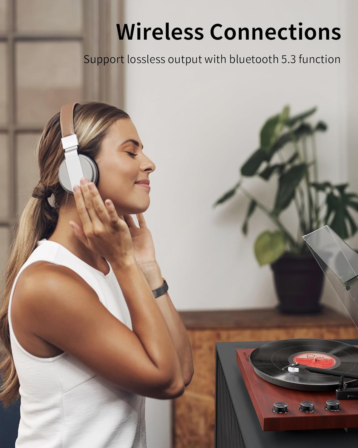 - 【Wireless Connectivity】Built-in Bluetooth 5.3, you can enjoy your vinyl collection with all the convenience of wireless technology. Connect via Bluetooth technology to listen to your favorite records on your wireless speakers, soundbar or headphones. Remove the troubles caused by the audio cable, and upgrade the grade from the visual and auditory sense. (Note:This record player doesn’t support Bluetooth input, so you can not connect phone via Bluetooth)