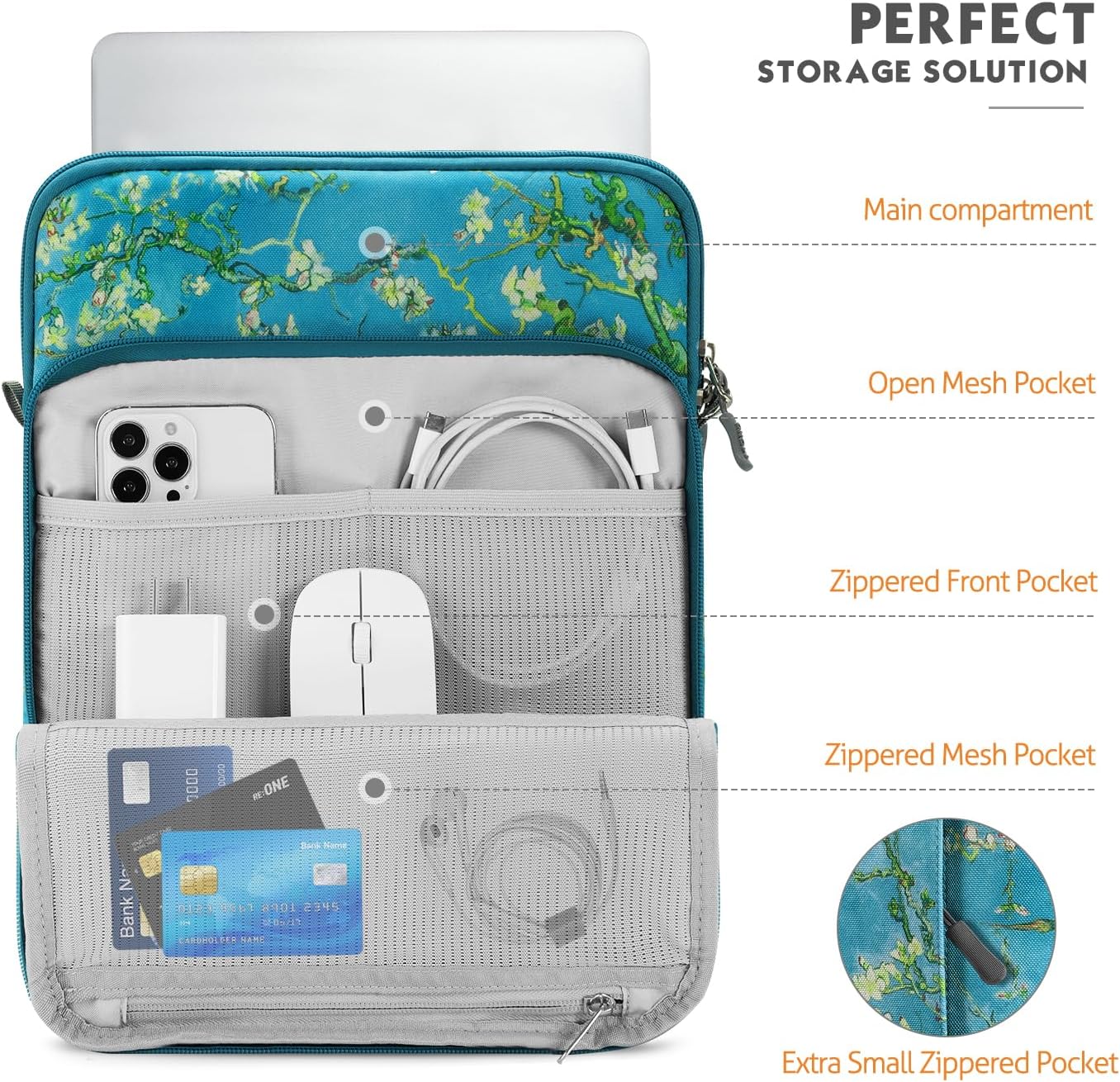 - LARGE CAPACITY: There are some pockets to organize your items. A main pocket for placing your devices up to 13.3 inch. And the front pocket with enough space for storing other accessories like your cellphone, chargers, USB cables, computer mouse, power bank, earphone, bank cards and other personal subjects.