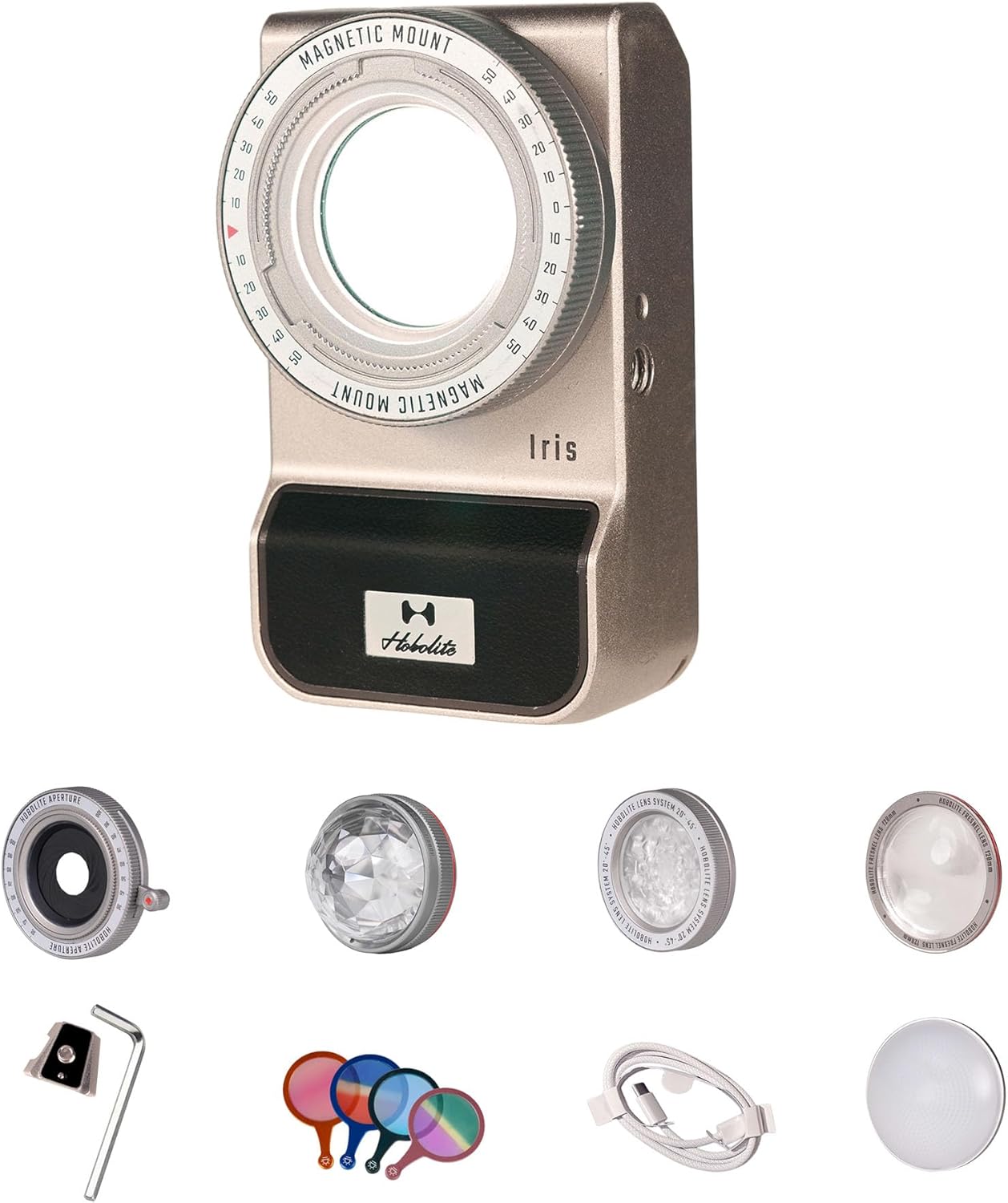 - Compact & Creative: The Hobolite Iris is a portable continuous LED light for photography, content creation, live streaming, and more. It has a vintage point-and-shoot camera design. The magic lens and colored gel filters included elevate the creative process.