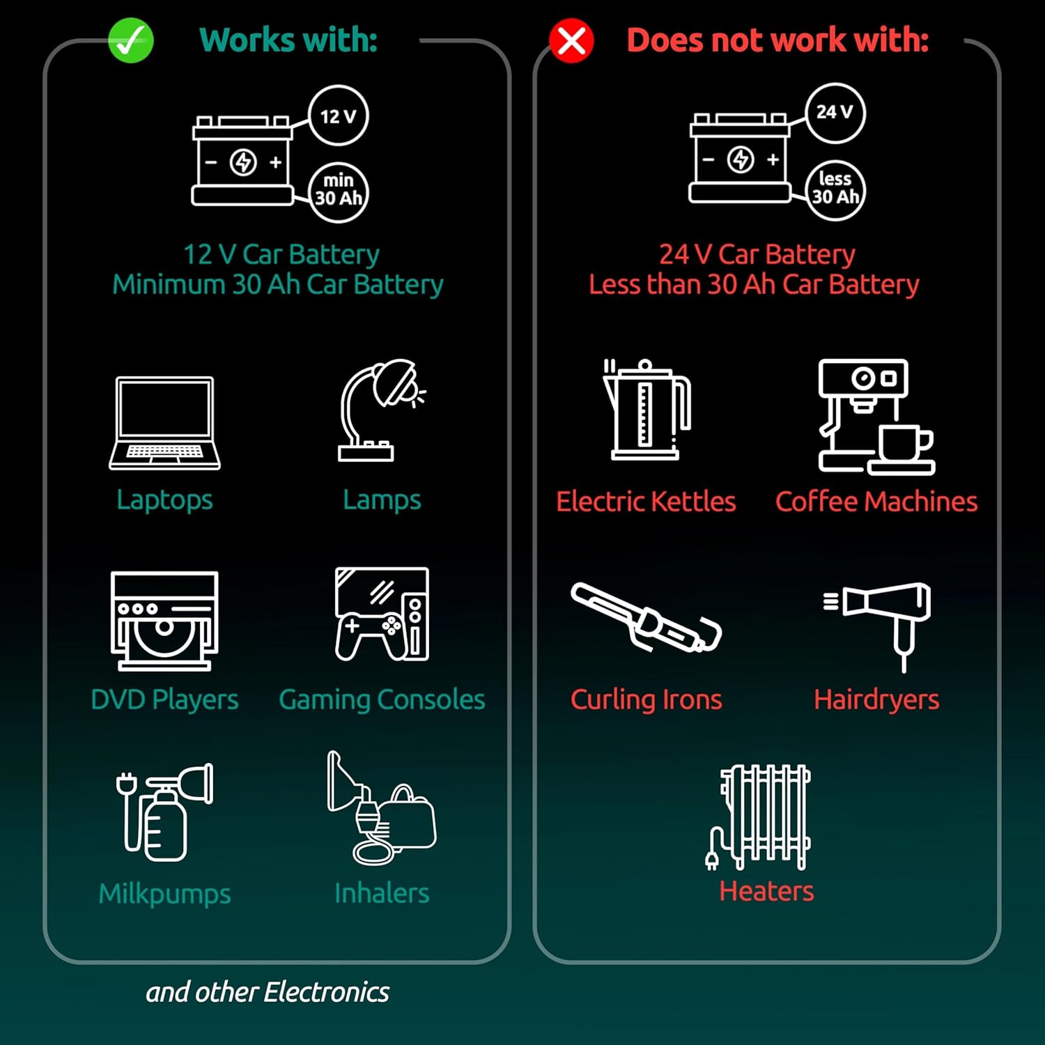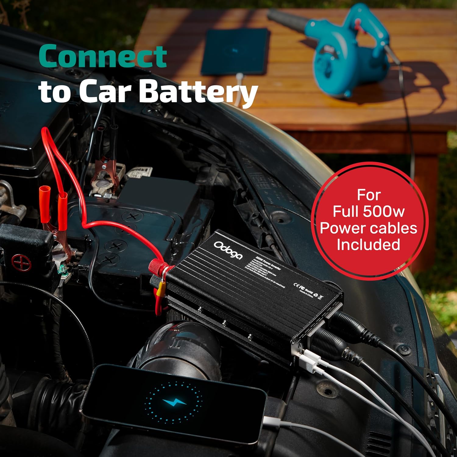 • VERSATILE CONVERSION: Ideal as a modified sine wave 150W car adapter for plug outlet or cigarette lighter adapter to wall plug. For the full 500 watt power inverter, connect it directly to the car battery, using the included alligator clips.
