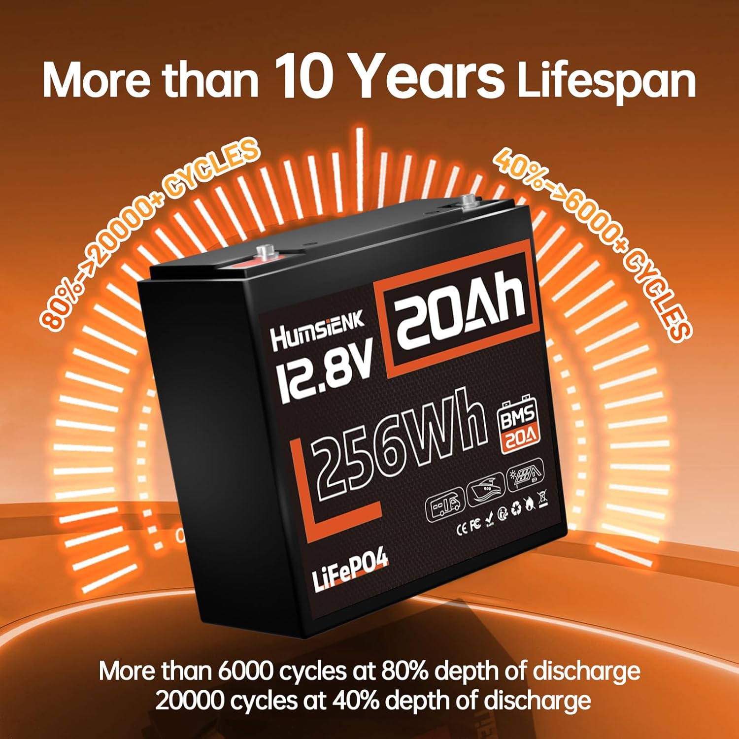 - Longer Service Life: This 12V 20Ah LiFePO4 battery is equipped with a BMS with multiple protection features such as overcurrent, overcharge, overdischarge, and overheat protection. In addition, the battery has an excellent self-discharge rate and can be stored for up to 1 year without maintenance after being fully charged.