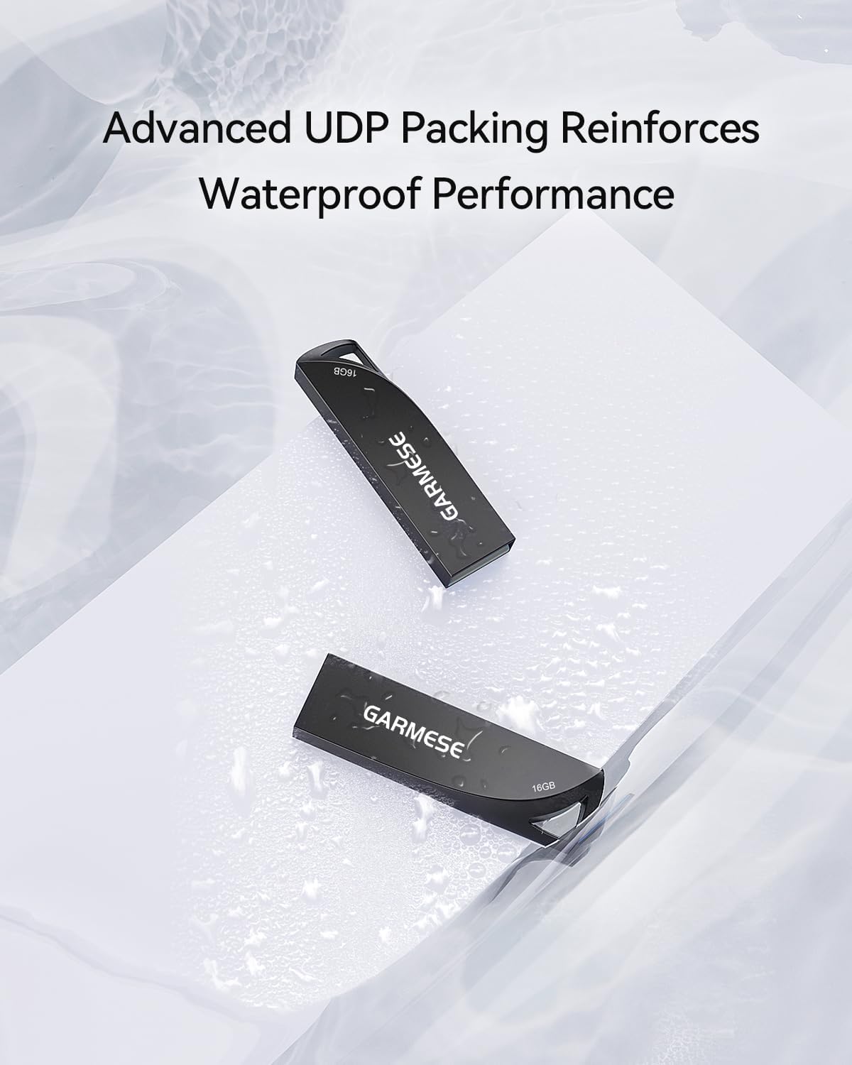 - 【WATERPROOF & DEPENDABLE】GARMESE USB drive utilizes cutting-edge UDP packaging technology to enhance its waterproof performance. After drying out if it gets wet, it can be used again. The all-metal design provides enhanced durability to withstand shocks and drops.