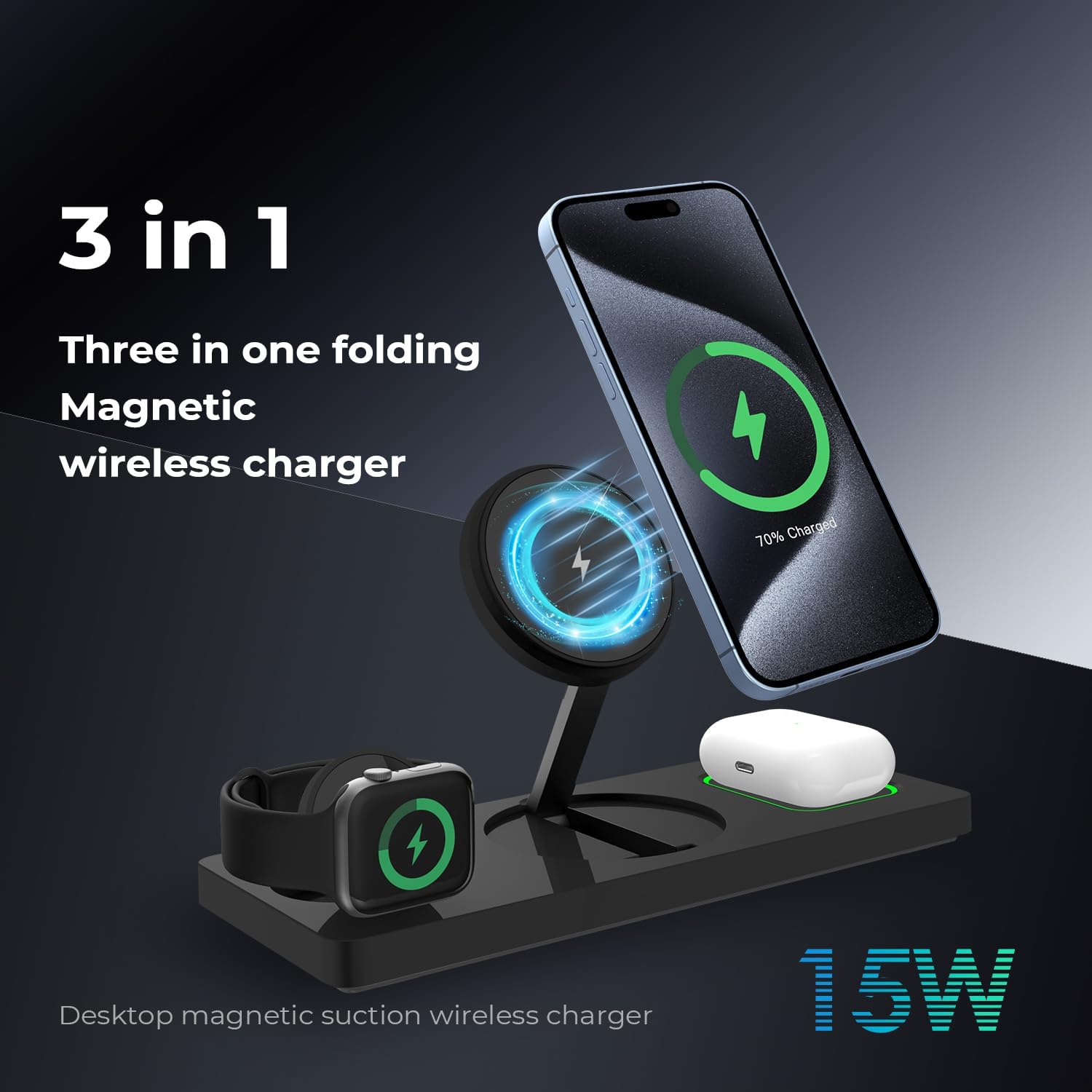 Wireless Charger Station 3 in 1, Fast Charging for iPhone 15/14/13/12 Pro/Max/Mini/Plus, Apple Watch 8/7/6/SE/5/4/3/2, AirPods 3/2/Pro/Pro 2, with Adapter (Black)