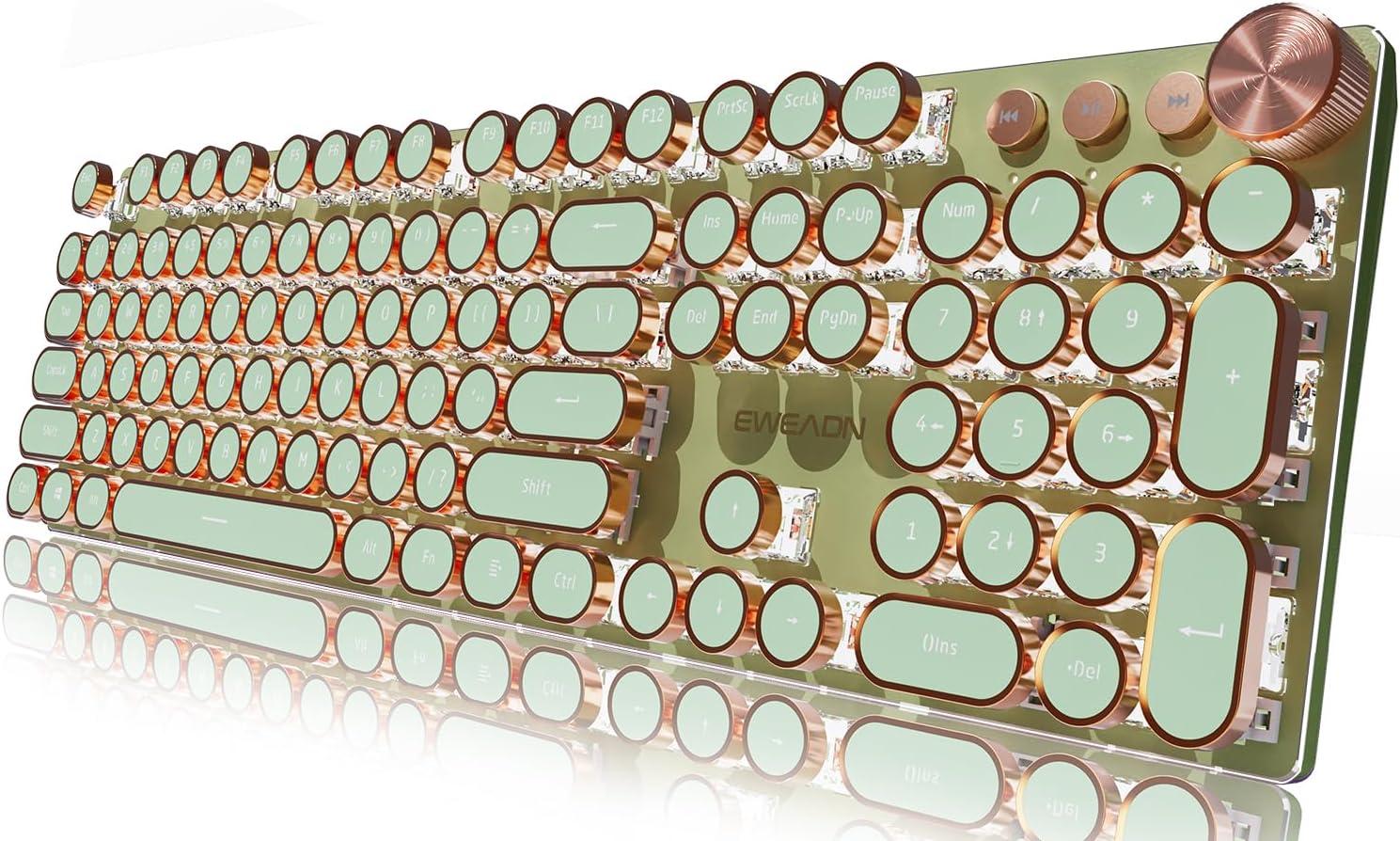EWEADN Typewriter Style Mechanical Gaming Keyboard, Wired Mechanical Keyboards,104 Keys Backlit LED Keyboards, Media Control Knob, Wired Computer Keyboard Pink Switch for Windows/Mac/PC-Green