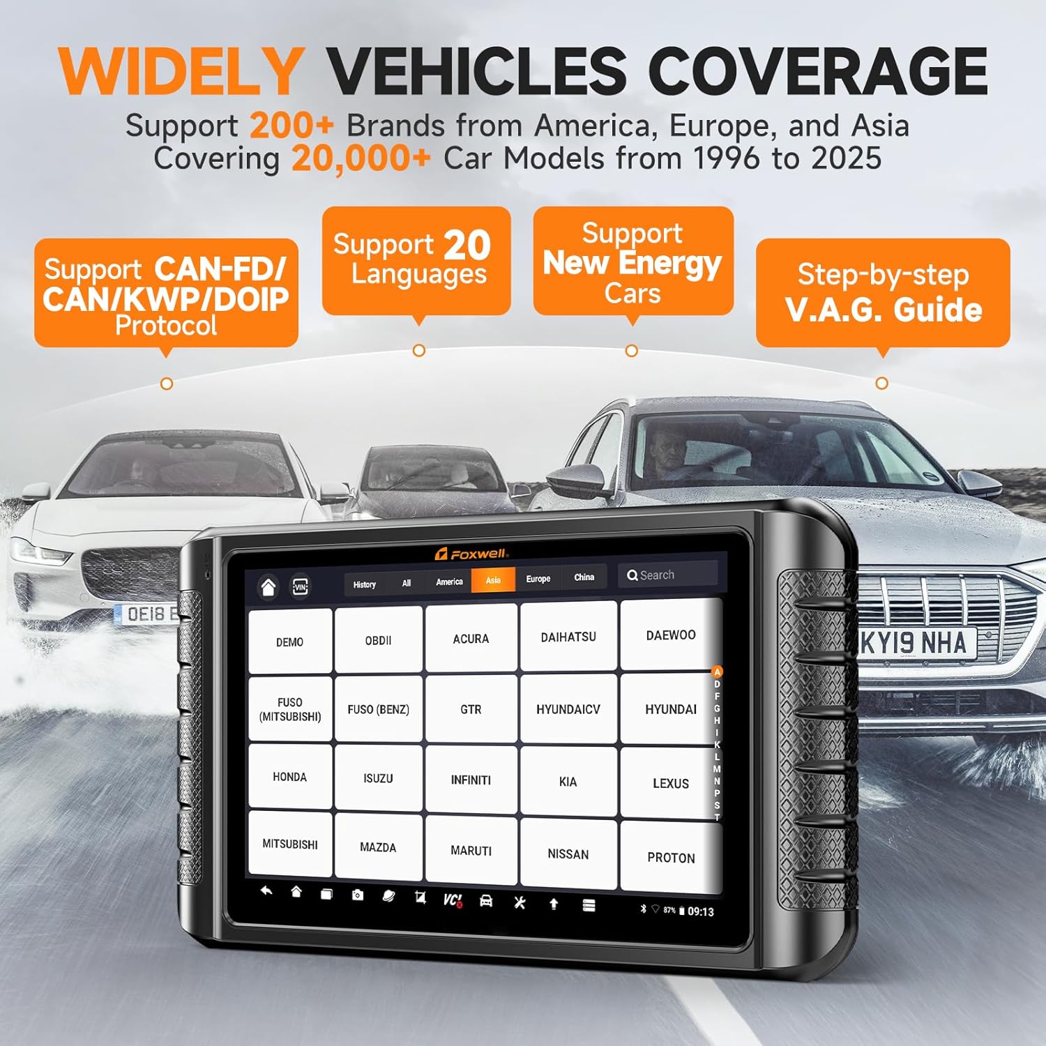 - [Tech Crown of FOXWELL] NT1009 is the highest version of Foxwell's diagnostic scanners currently, which is highlighted by its ①Quick & flexible wireless all system diagnosis--faster than bluetooth②Bi-Directional control;③All resets maintenance(Most scanners on the market only support some common special features);④Brush hidden functions;⑤Topology Mapping⑥Clear VAG guidance(fit for VW/Audi/Skoda/SEAT);⑦FCA SGW supports(fit for Chrysler/Dodge/Jeep/Alfa Romeo/Fiat after 2018);⑧Supports CAN/CAN-FD/KWP/DoIP protocols;⑨Built in android Apps for easy software update & data printing;⑩Compatible with 99.99% cars;⑪Support for 20 languages