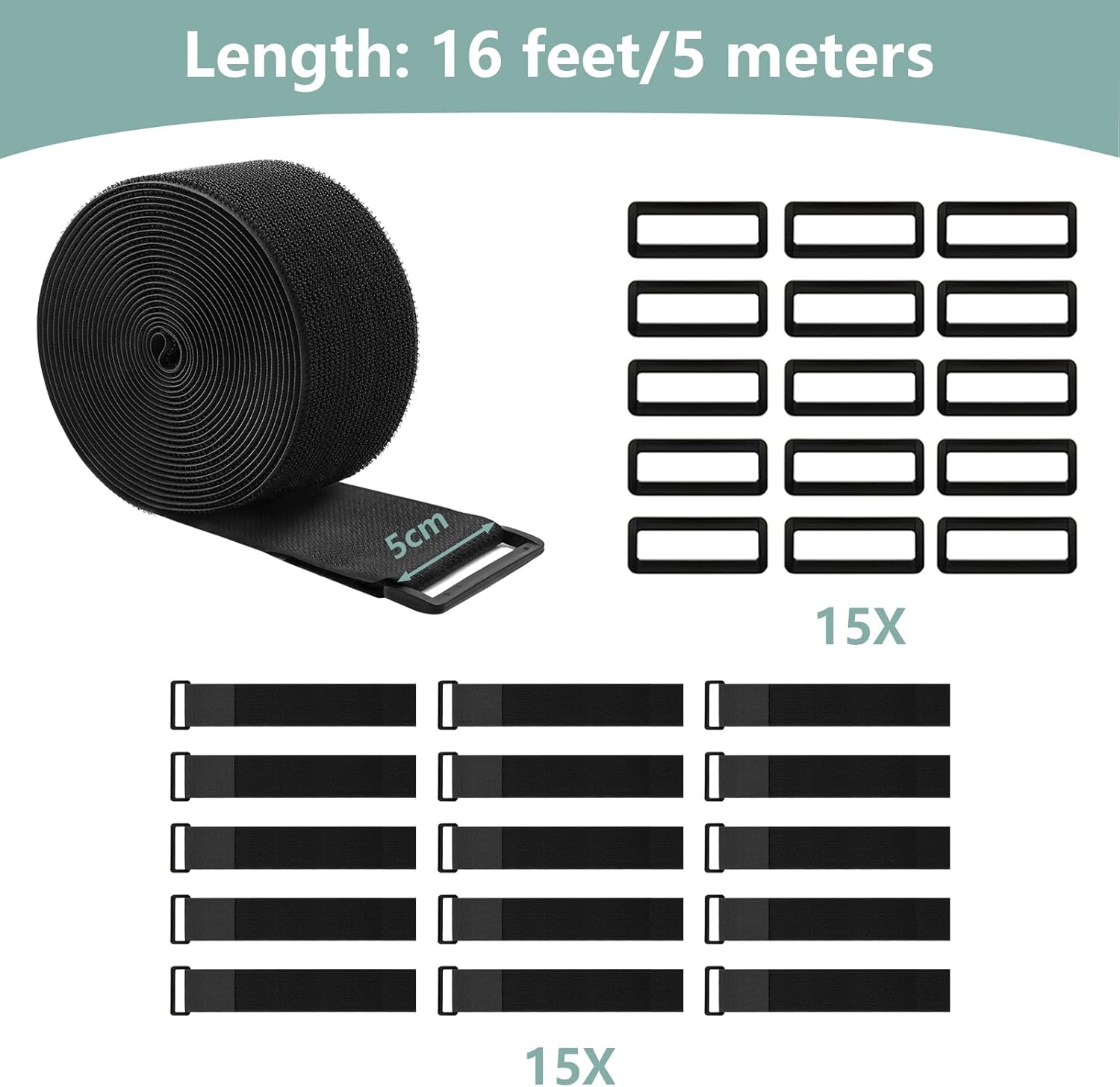 2In x 16Ft Cable Straps Heavy Duty With 15 Buckles, Black Hook and Loop Straps, Reusable Cable Ties for Organizer or Storage