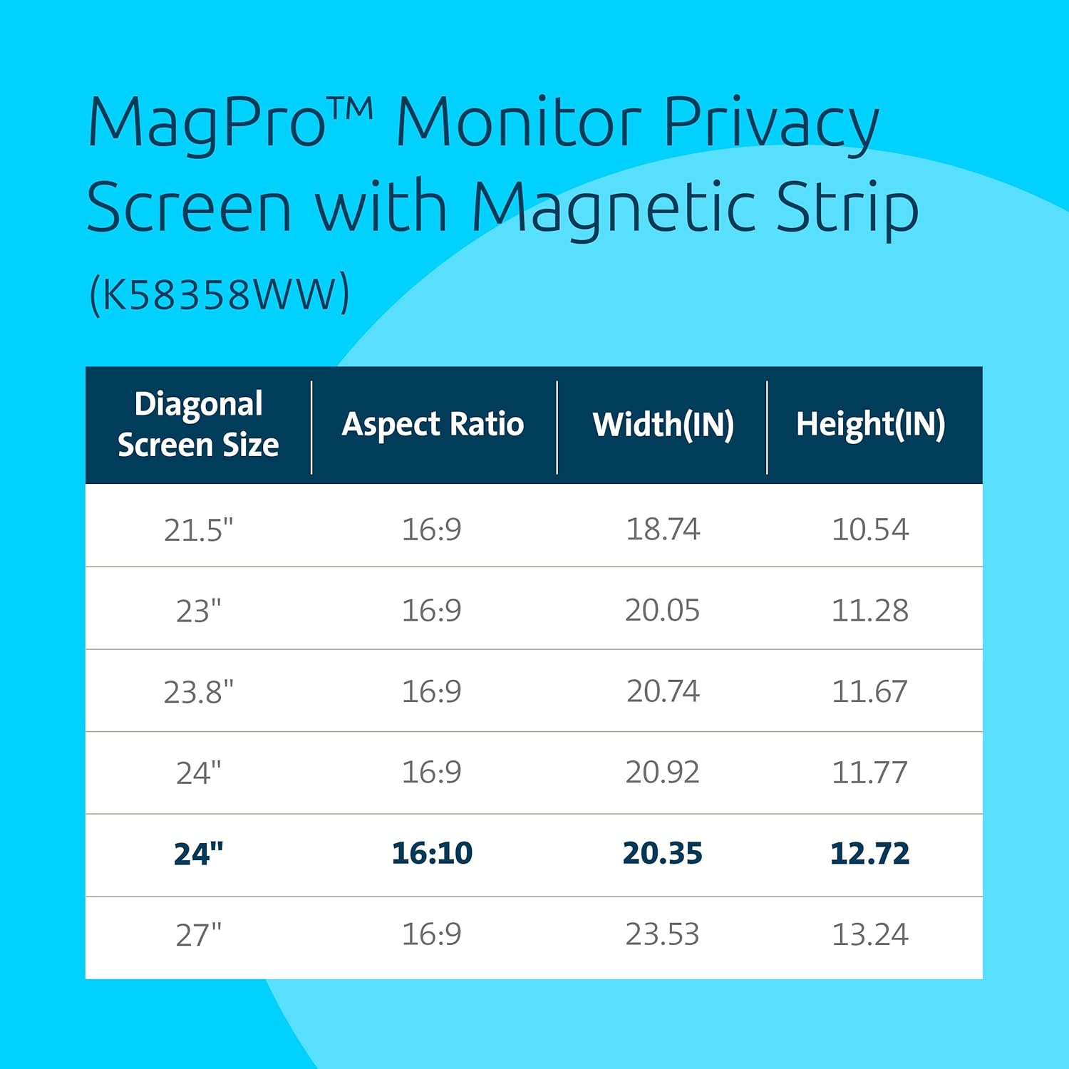 Kensington MagPro 24 Inch Magnetic Computer Privacy Screen for Desktop, Removable 16:10 Computer Privacy Filter, Anti-Glare Blue Ray Reduction, Compatible with Slim Bezel Monitors, K55423WW