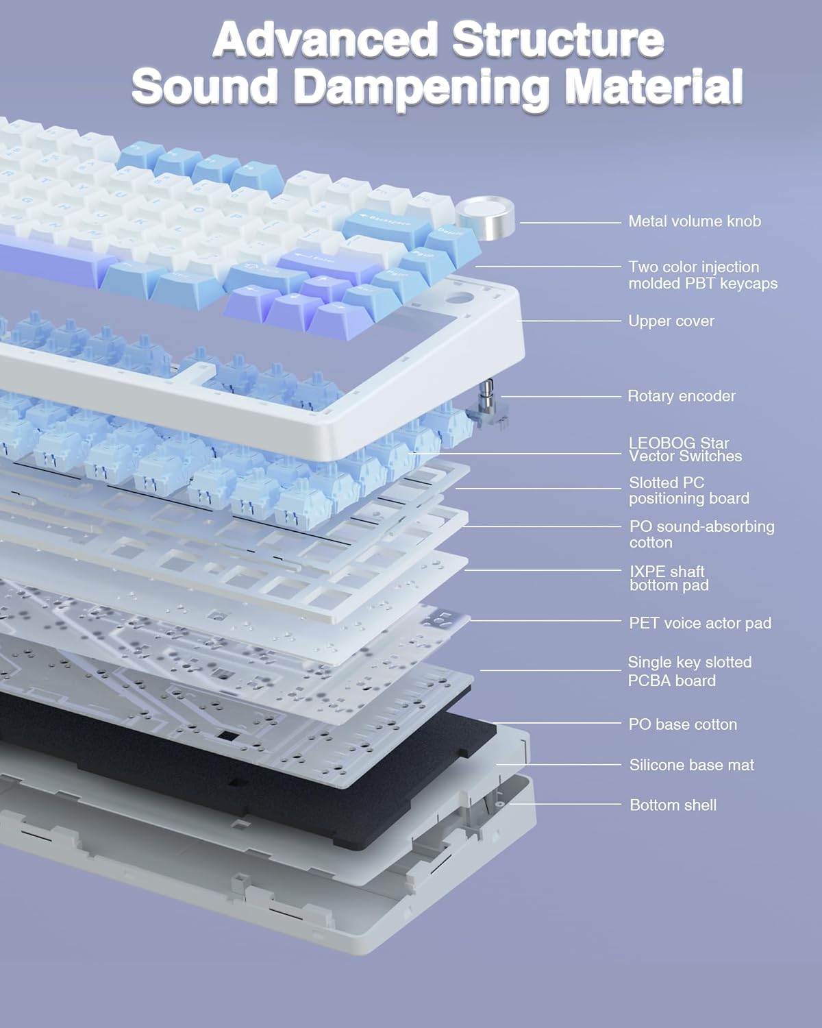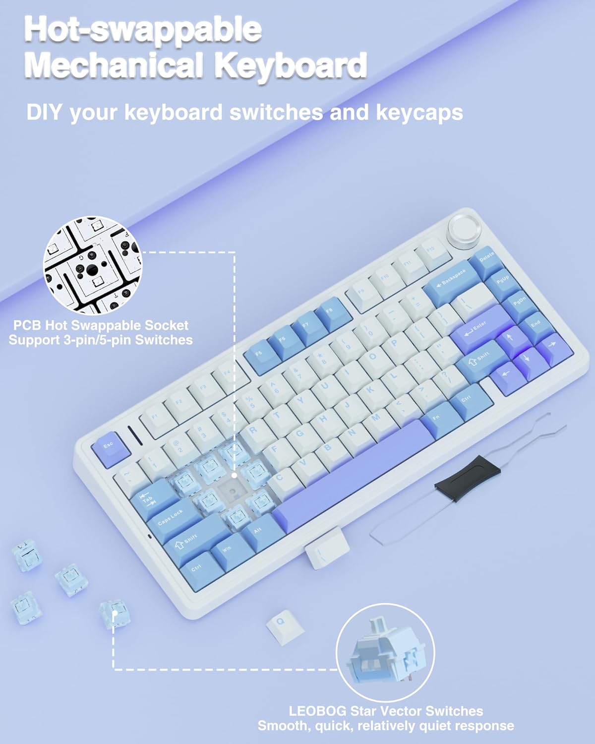 - Hot-swap Custom Keyboard: This custom mechanical keyboard with hot-swappable base supports 3-pin or 5-pin switches replacement. Even keyboard beginners can easily DIY there own keyboards without soldering issue. F75 gaming keyboards equipped with pre-lubricated stabilizers and LEOBOG star vector switches, bring smooth typing feeling and pleasant creamy mechanical sound, provide fast response for exciting game