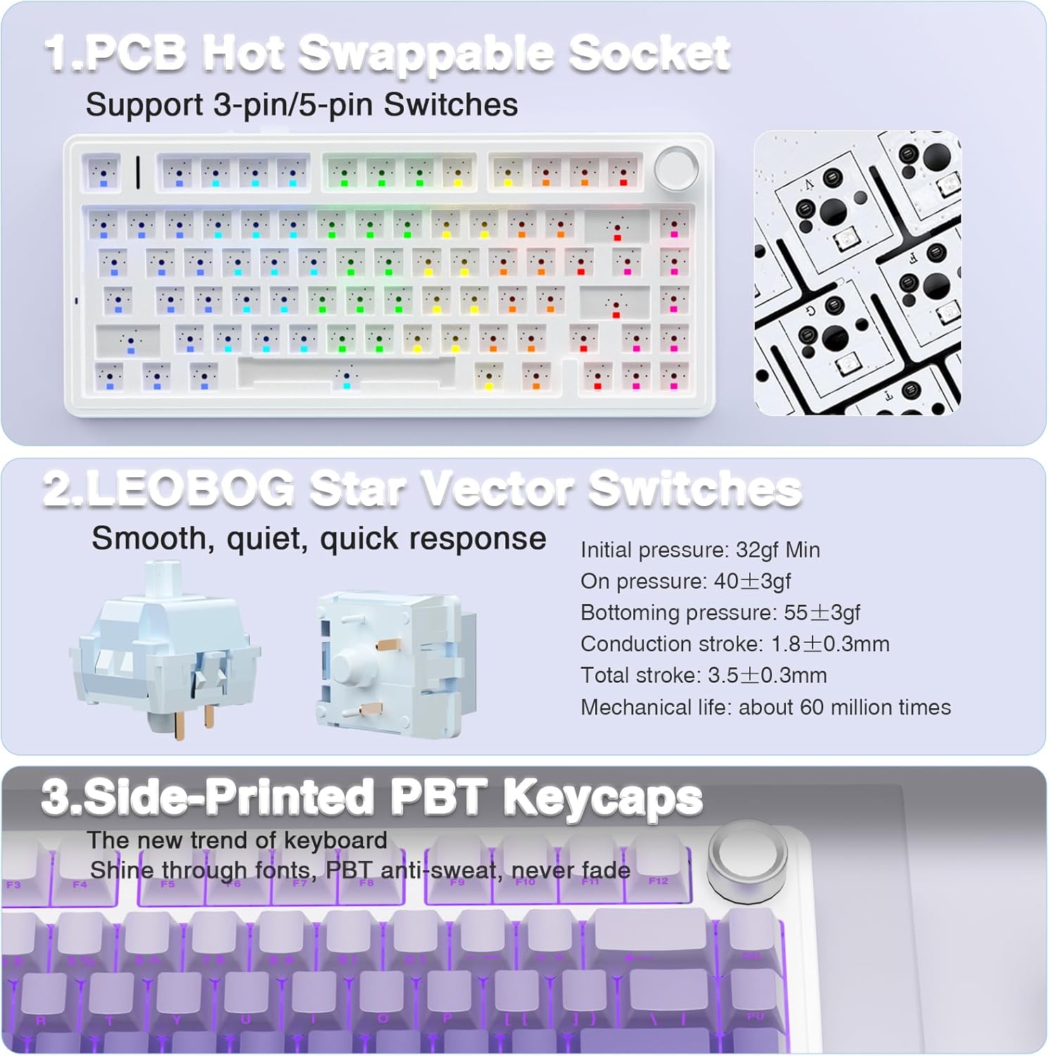 - Hot-swap Custom Keyboard: This custom mechanical keyboard with hot-swappable base supports 3-pin or 5-pin switches replacement. Even keyboard beginners can easily DIY there own keyboards without soldering issue. F75 Pro gaming keyboards equipped with pre-lubricated stabilizers and LEOBOG star vector switches, bring smooth typing feeling and pleasant creamy mechanical sound, provide fast response for exciting game