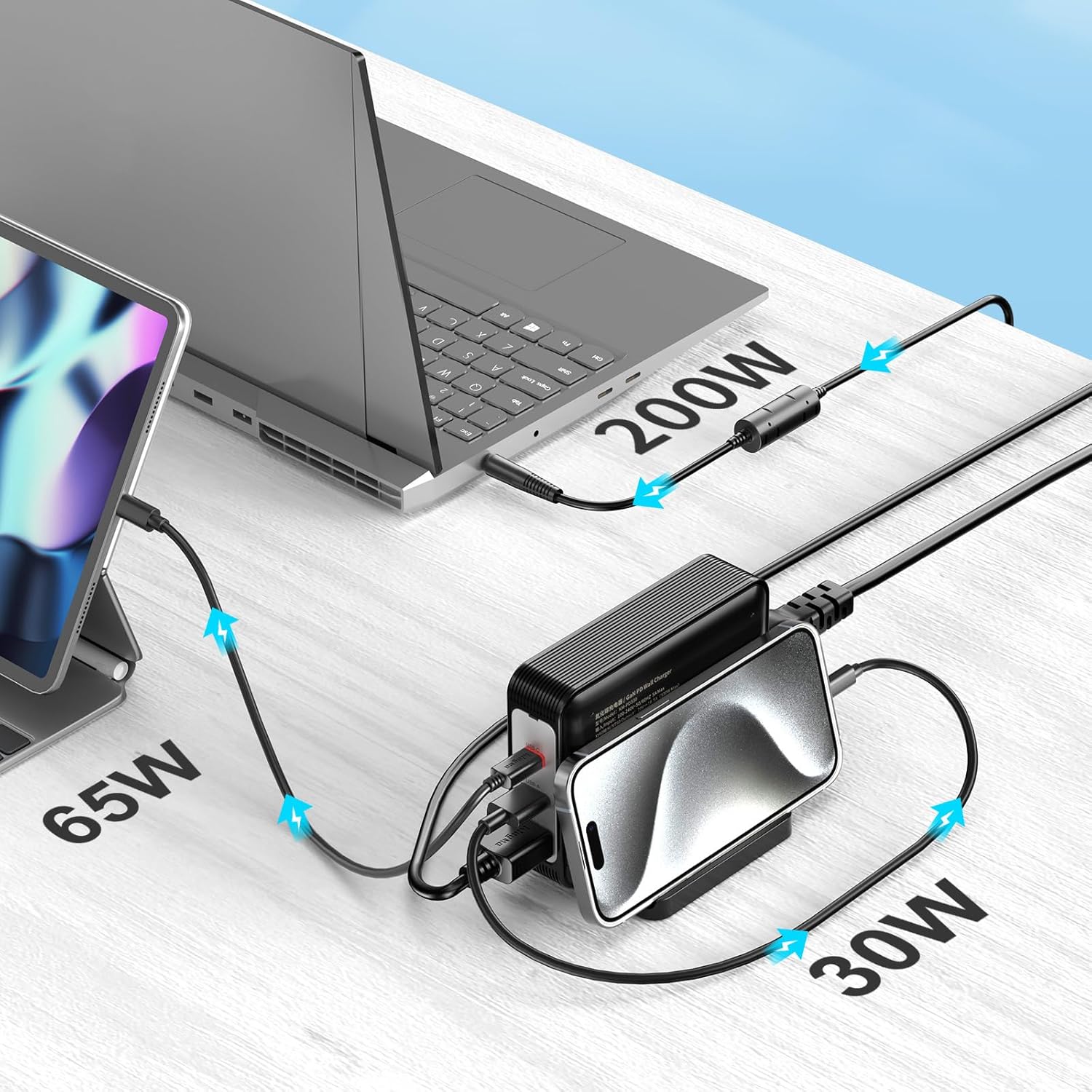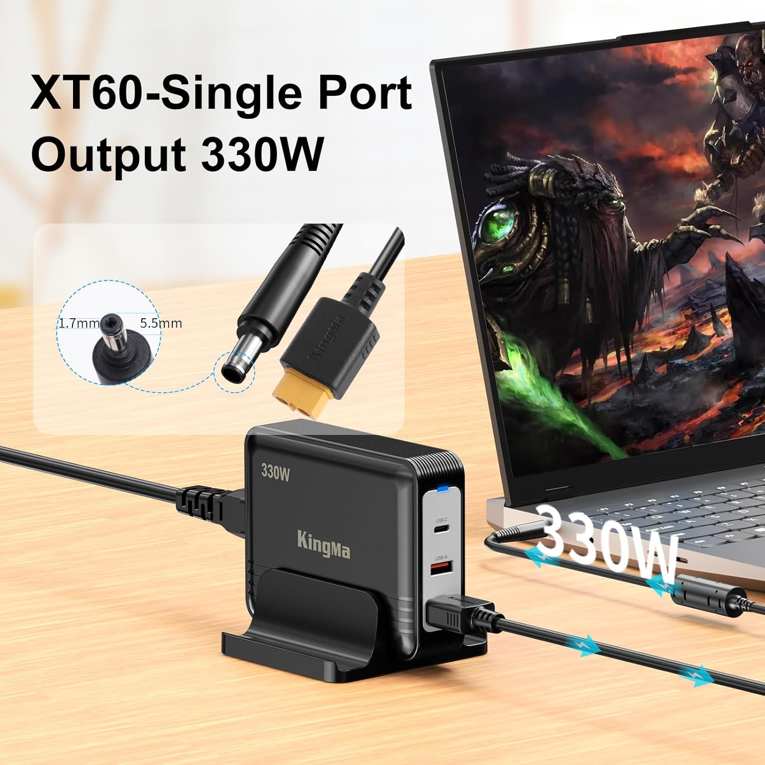 - 【330W single port output】King Ma laptopt GaN charger design with a XT60 Port,witch can up to 330W single port output,equipt with professional latop cable to charging the professional computer,and there are equiped with a USB-C(100W) and a USB-A(60W) port, for game developers and senior engineers.
