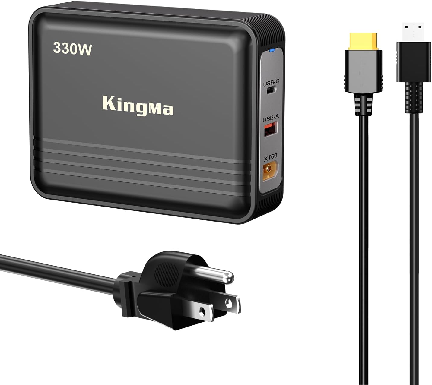 - 【330W single port output】King Ma laptopt GaN charger design with a XT60 Port,witch can up to 330W single port output,equipt with professional latop cable to charging the professional computer,and there are equiped with a USB-C(100W) and a USB-A(60W) port, for game developers and senior engineers.