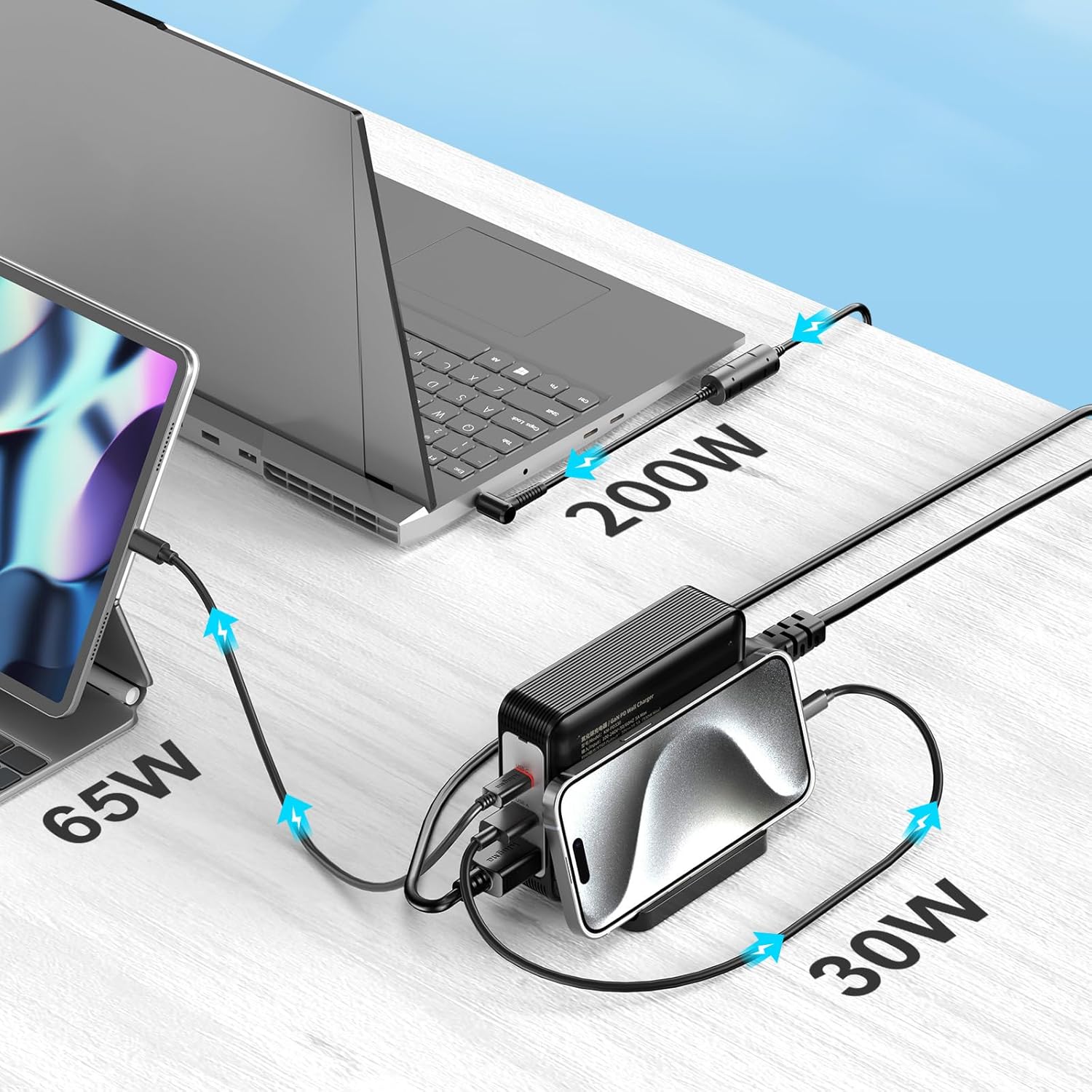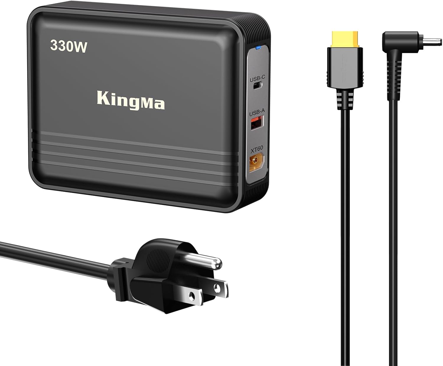 - 【330W single port output】King Ma laptopt GaN charger design with a XT60 Port,witch can up to 330W single port output,equipt with professional latop cable to charging the professional computer,and there are equiped with a USB-C(100W) and a USB-A(60W) port, for game developers and senior engineers.