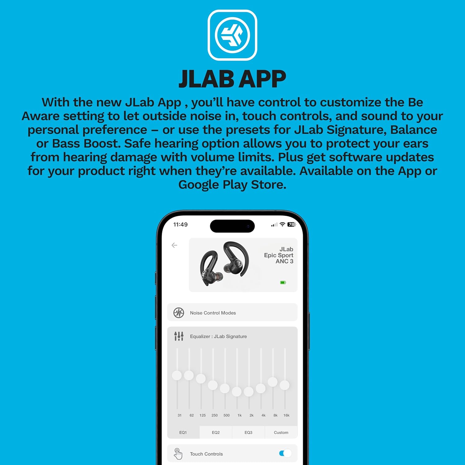 - 📱 JLAB APP: With the new JLab App, you’ll have control to customize the Be Aware setting to let outside noise in, touch controls, and sound to your personal preference – or use the presets for JLab Signature, Balance or Bass Boost. Safe hearing option allows you to protect your ears from hearing damage with volume limits. Plus get software updates for your product right when they’re available. Available on the App or Google Play Store.