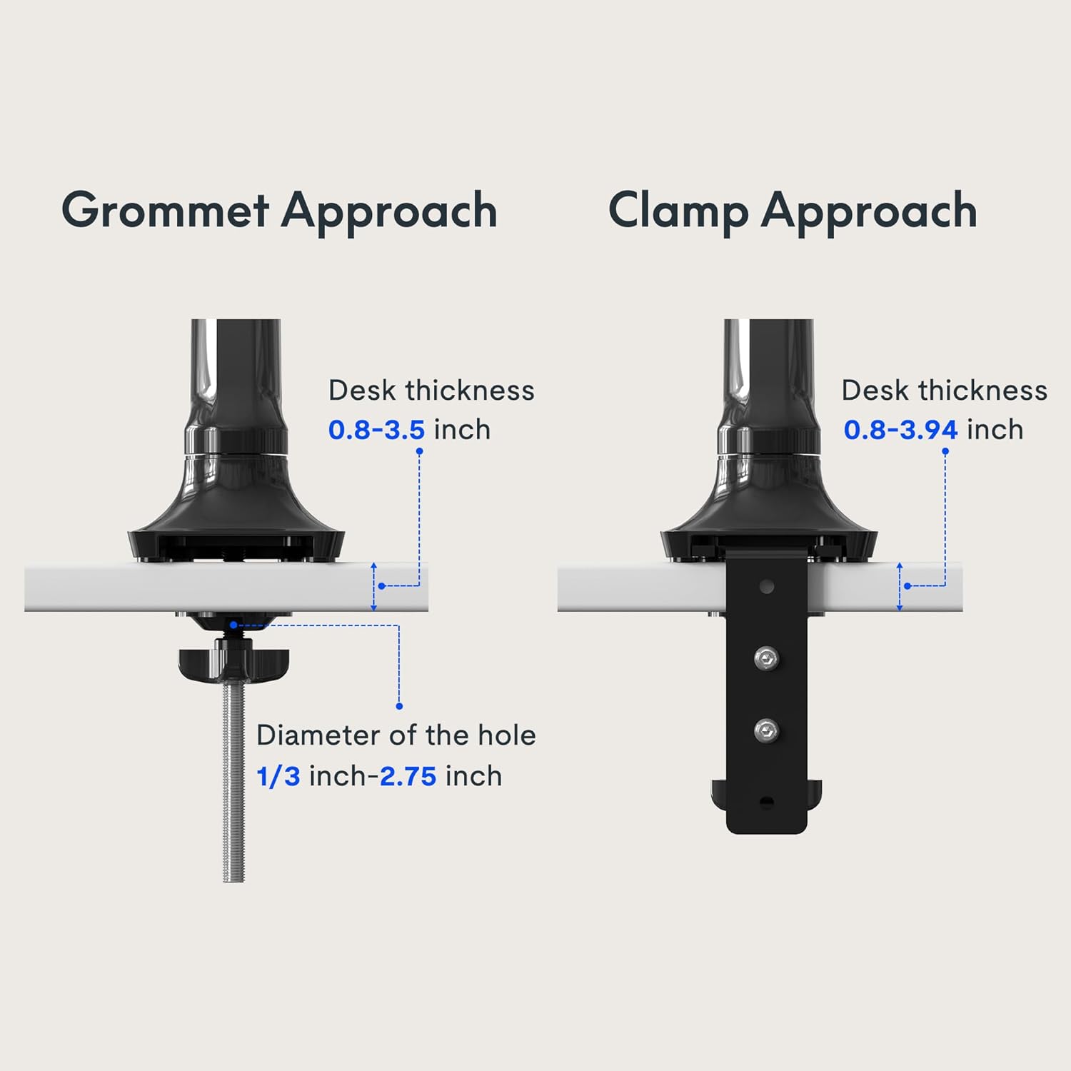- C-Clamp or Grommet Base: The C-clamp or grommet mounting base will save more than 80% desktop space compared to a vertical monitor stand with a heavy-duty base. (Max weight capacity up to 11lbs)