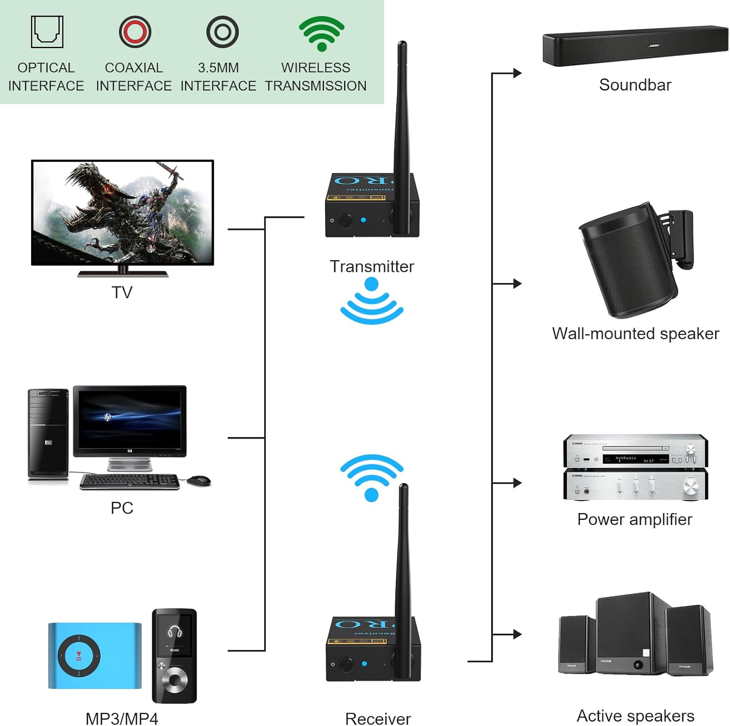 - 【HiFi Lossless Audio Quality & 20ms Low Latency 】The wireless audio transmitter is equipped with high-resolution audio technology,clear and stable with no noise, which exceeds the sound quality standards of traditional CDs.And with the stable 2.4GHz wireless technology,the wireless coaxial transmitter realizes ultra-low latency of 20ms for audio transmission,really achieveing the audio synchronization. it will ensures the ultimate entertainment experience when you listen to music at home or in the office. NOTE:When the audio is low, there is a noise and its subtle.