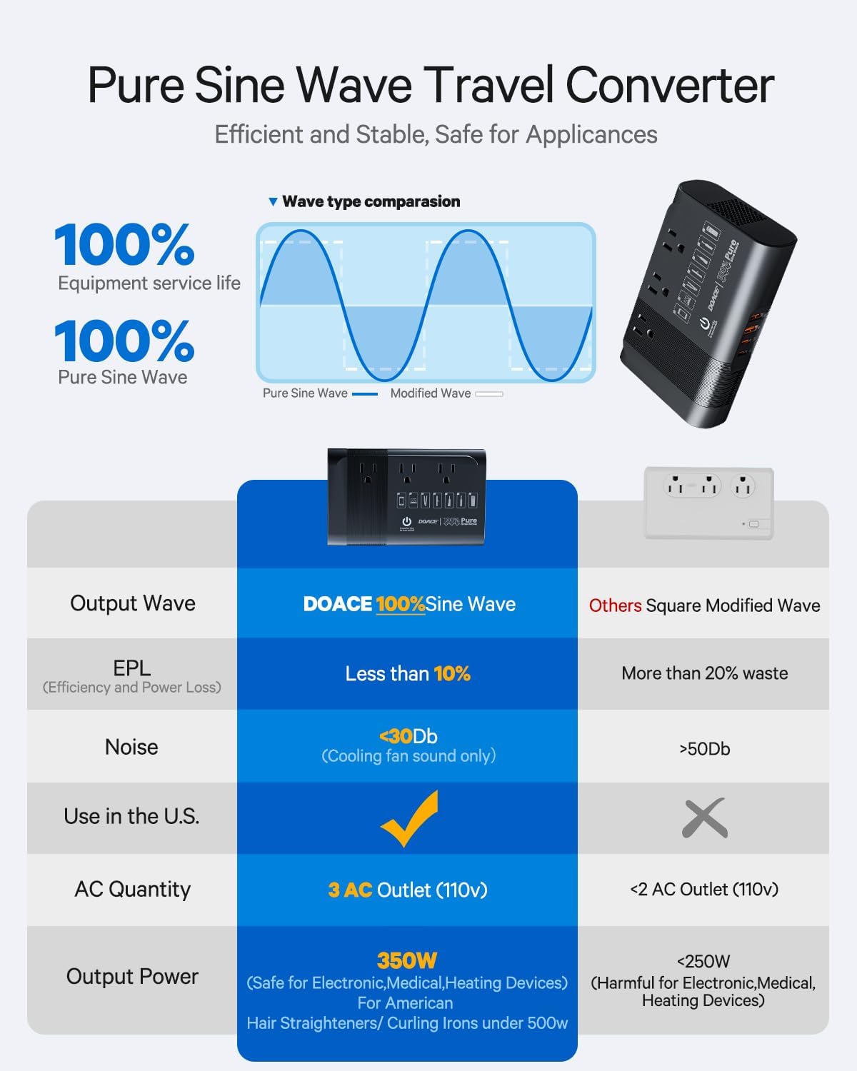 - [100% Pure Sine Wave Save Your Devices] Pure sine wave power is a quieter, cleaner, and more reliable power source than you use at home. DOACE Travel Converter can output high-quality pure sine wave voltage to protect your electronic devices, appliances with motors, audio and video equipment, and medical equipment.