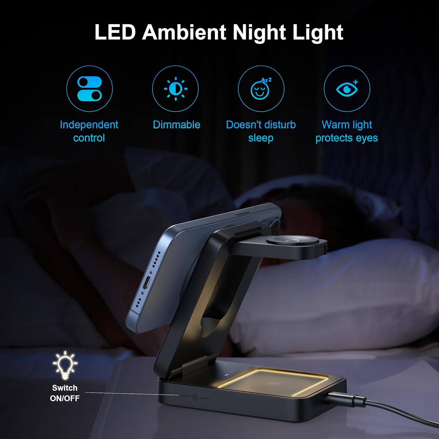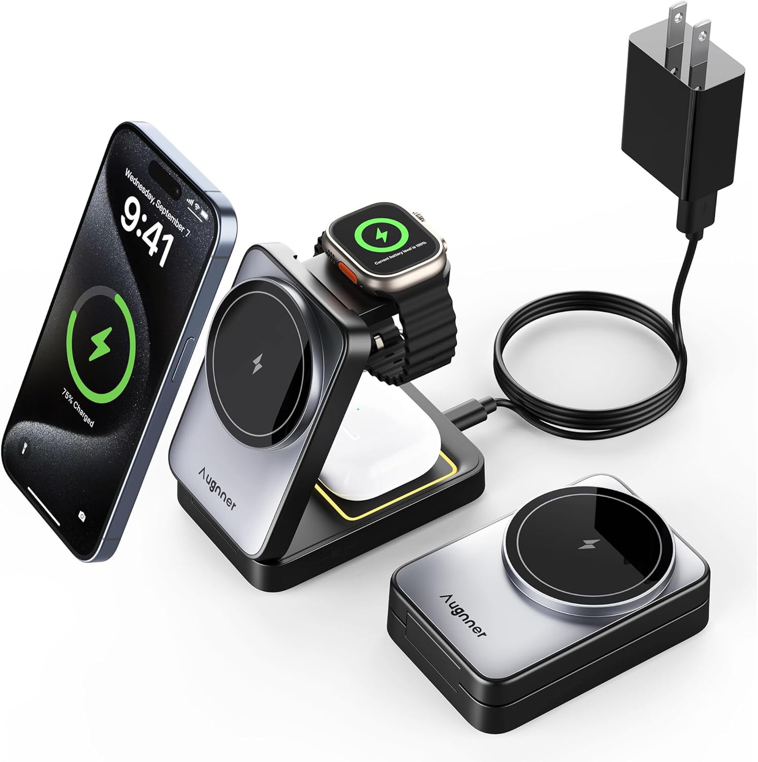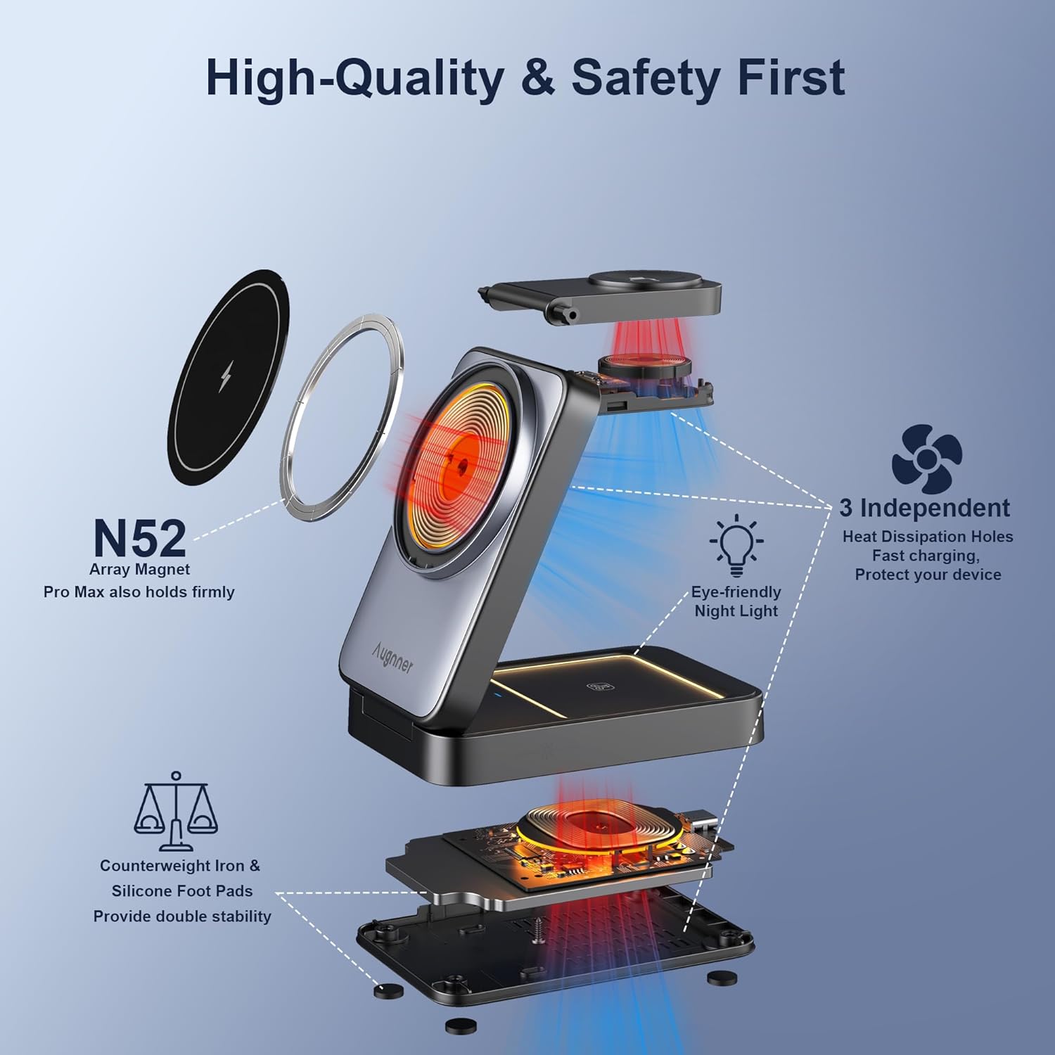 - 【More User-Friendly Design】Augnner wireless charging station has a controllable night light, perfect for bedside. The earbuds charging area has an independent indicator light. The N52 magnet has super strong suction force, and even the weight of three phones can be firmly absorbed. The folding structure is stable and can withstand tens of thousands of tests without loosening.