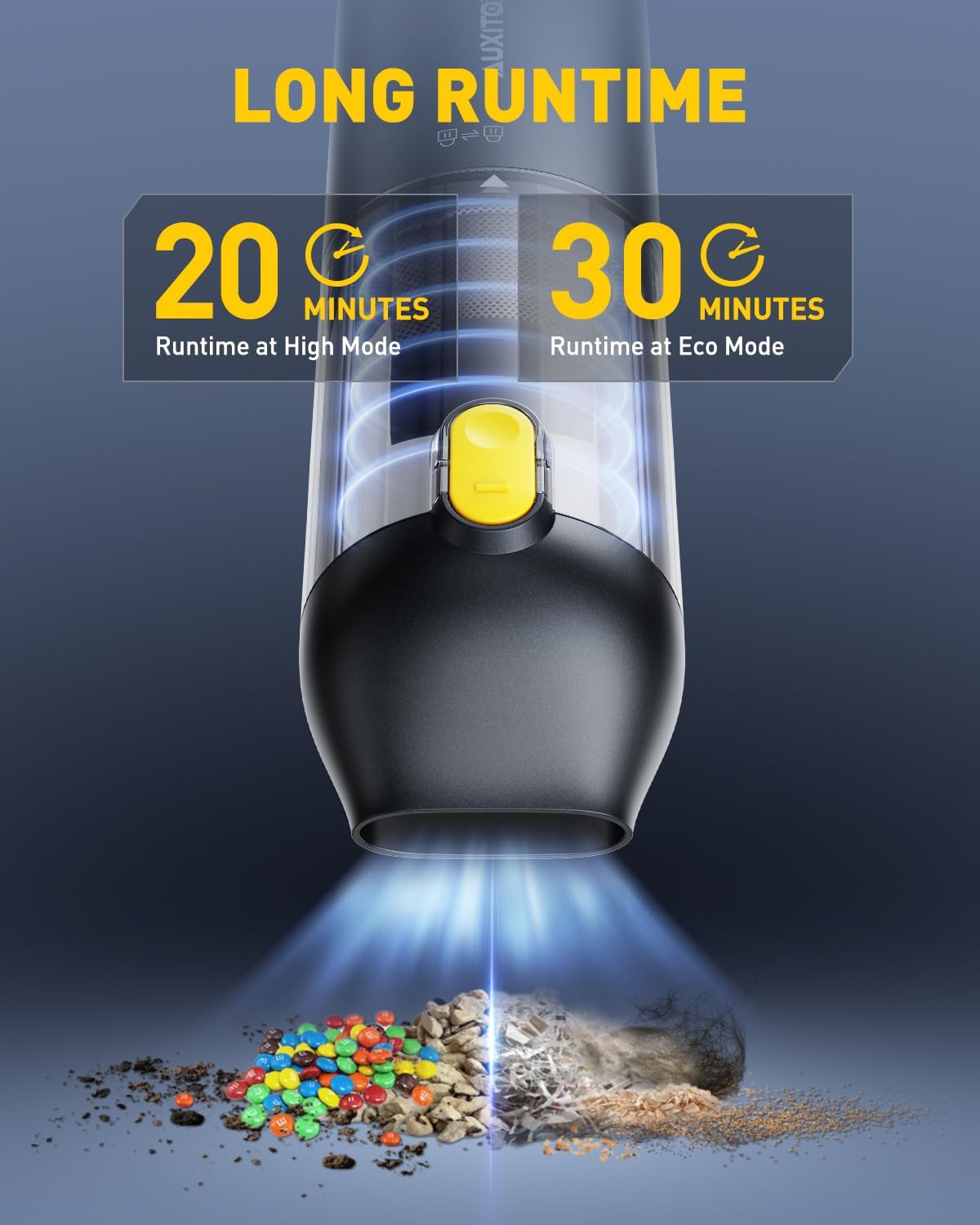 - 【14000PA HIGH POWER SUCTION HANDHELD VACUUM】The upgraded high-speed brushless motor delivers 14000Pa of powerful suction to quickly and easily pick up stubborn sand, dust, and debris. 2 suction modes of 8500PA and 14000PA are available to meet your different cleaning needs. (Under ideal conditions, max suction reaches 14Kpa. In high-speed mode, low battery may reduce power—recharge promptly for optimal performance)