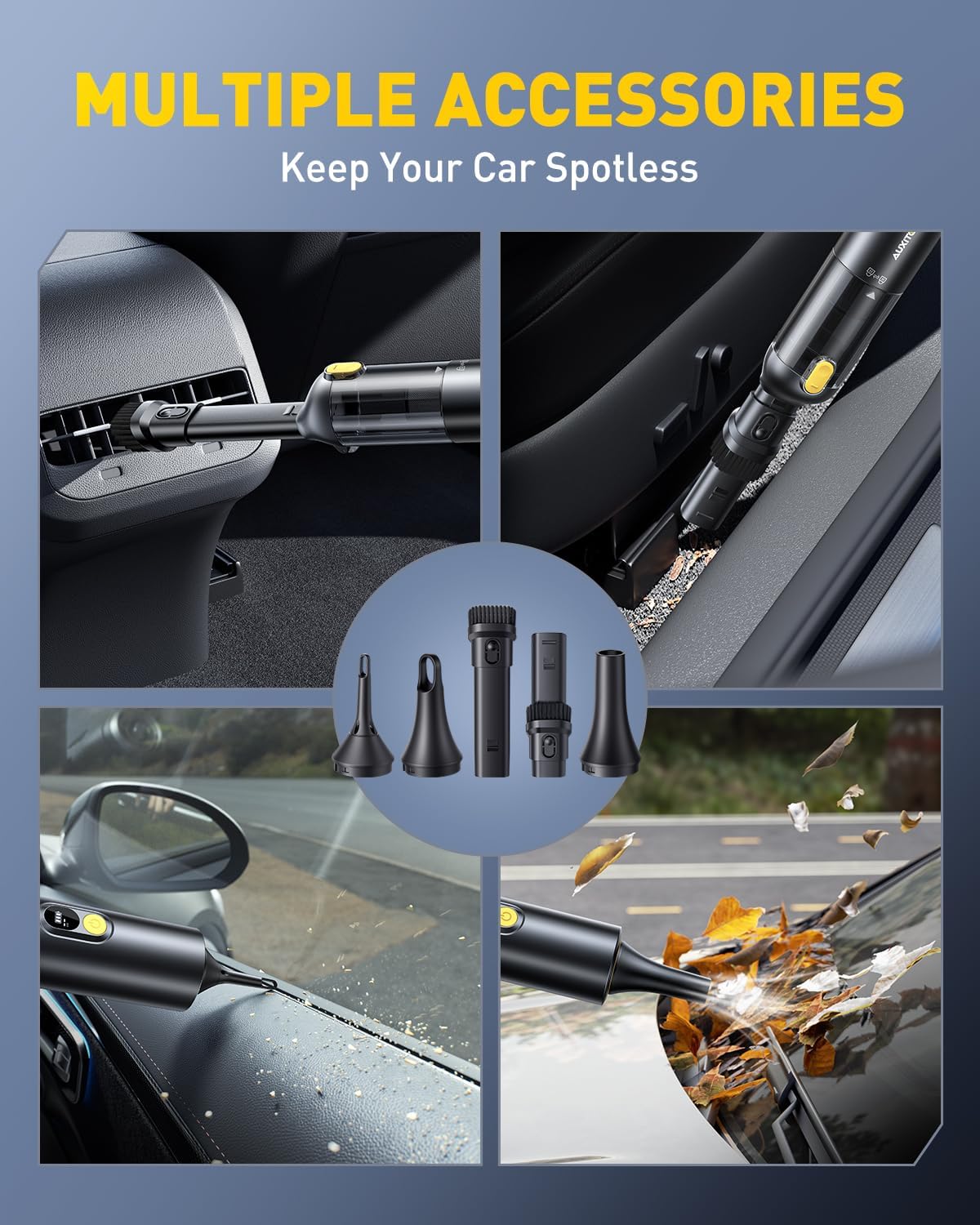 - 【4 IN 1 MULTI-FUNCTIONAL CORDLESS CAR VACUUM】AUXITO Mini Vacuum Car Cleaner is equipped with a variety of nozzles to perfectly meet the different needs of vacuuming, blowing, inflating and pumping. It not only quickly cleans car seats, trunks, floor mats, computer keyboards, sofas, carpets and any hard-to-reach places, but also helps to inflate yoga balls, swimming rings and all inflatable items, and vacuums air for all kinds of vacuum storage bags to save space (Our car vacuum is ideal for cleaning the details of the car interior as well as indoor detail cleaning, office desk, computer keyboard dust, but not for extensive area cleaning)
