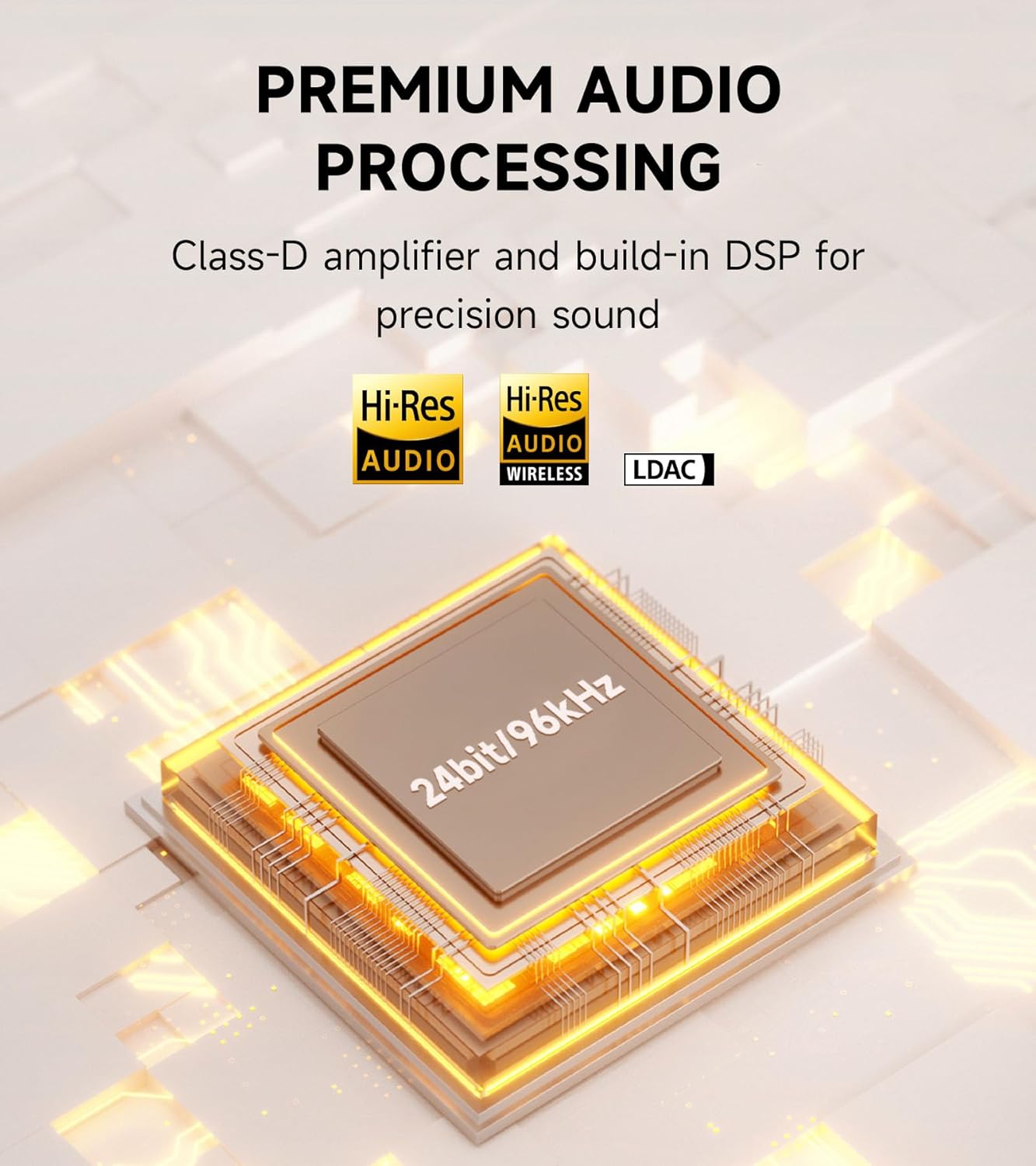 - [High-Quality Audio Processing] Experience high-resolution audio with M series speakers, featuring full digital processing, Class-D amplification, and Hi-Res Audio certification for both wired and wireless transmission, along with precise two-way active crossover and dynamic range control provided by a built-in DSP
