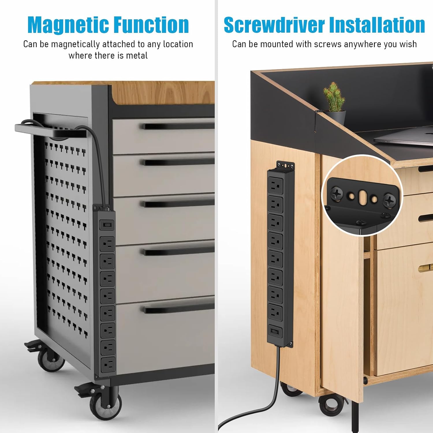 - Magnetic Mountable Power Strip: This power outlet is designed with a magnetic mounting feature that allows it to be mounted on metal surfaces without drilling. There are 4 screws included in the package so you can mount it anywhere you want. There are multiple mounting options to choose from, which is a nice feature.