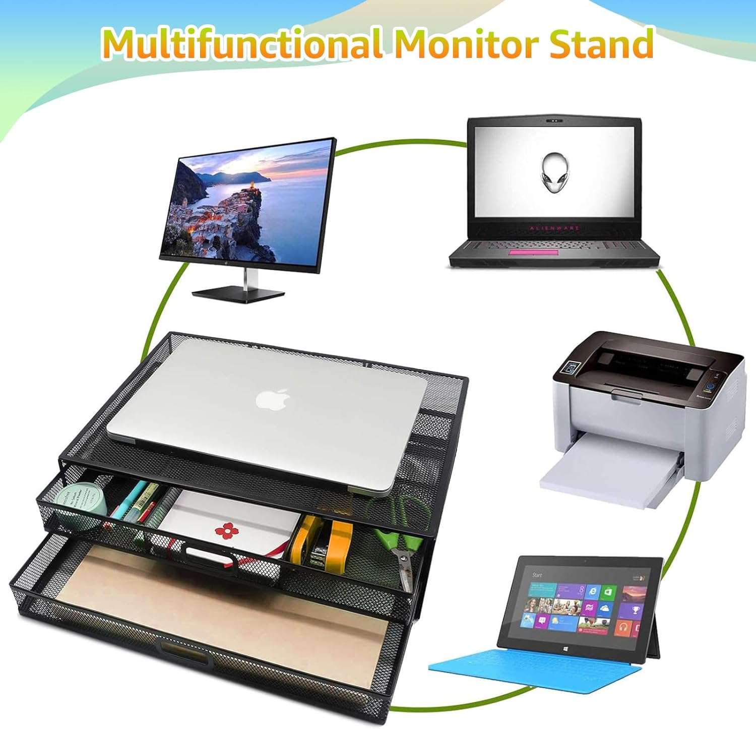Computer Monitor Stands with Drawers, Metal Mesh Desktop Monitor Riser, Desk Storage Organizer with Drawers for PC, Laptop, Printer (Black)