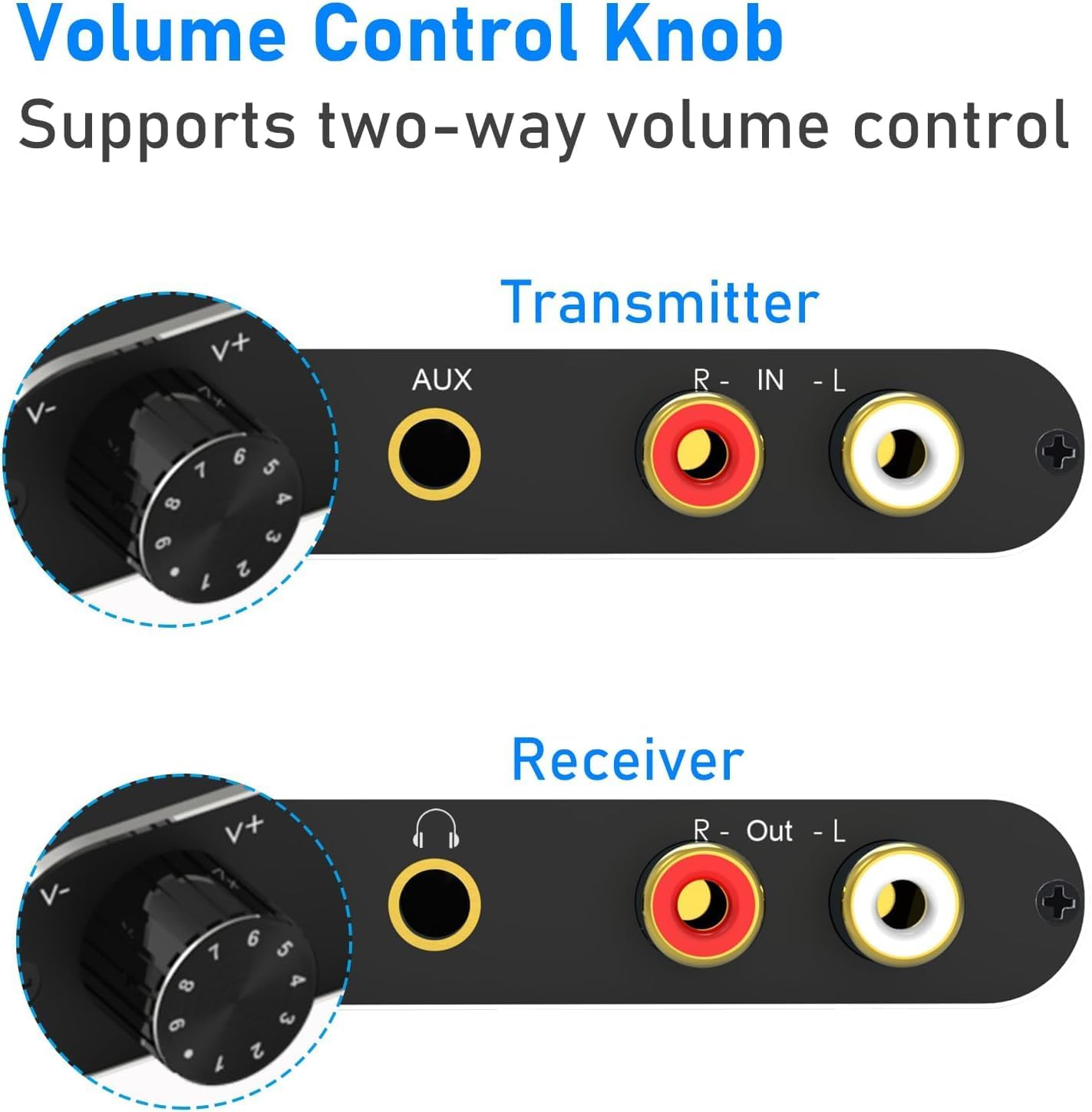 - 【Widely Compability】For transmitter, you can use the aux in or RCA interface. for the receiver,you can use the aux out or RCA to your audio devices. for example: home stereo, speaker, headphones.