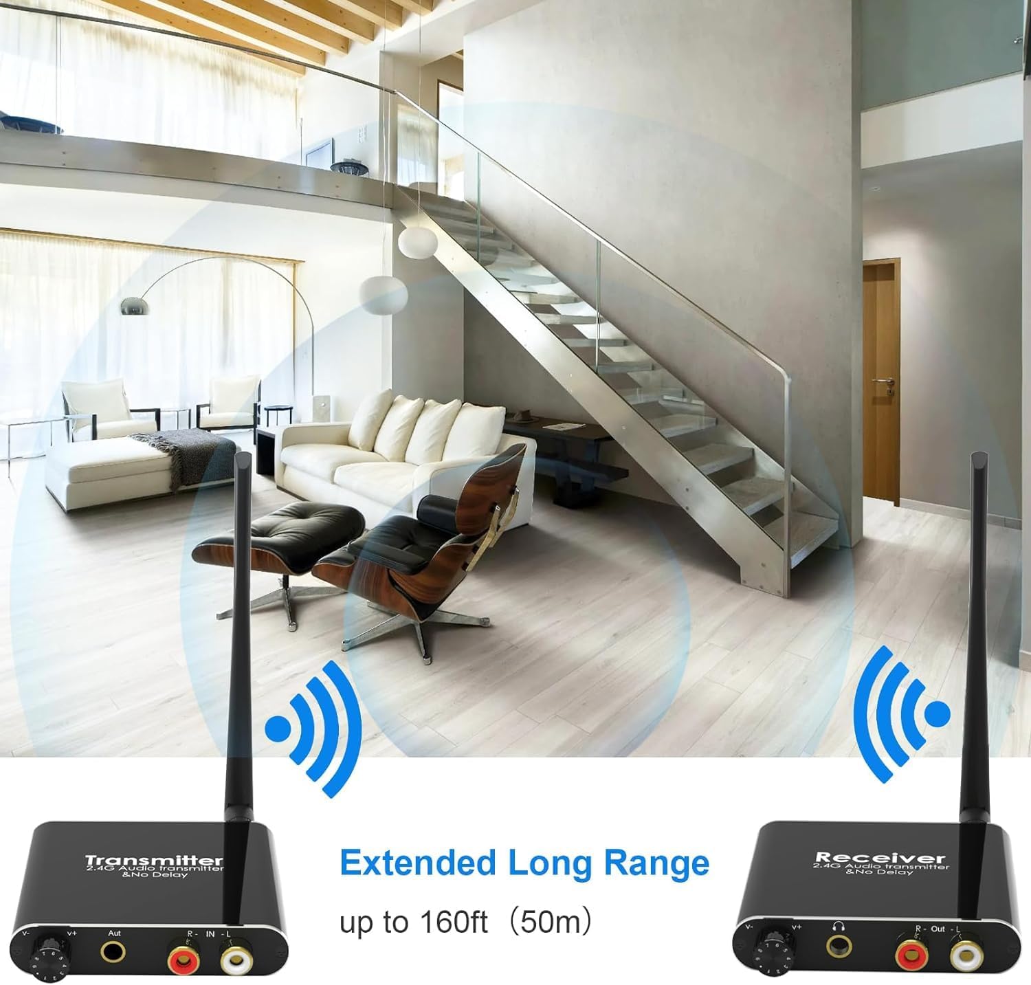 eppfun 50m/2.4G Wireless Audio Transmitter Receiver for 2 Subwoofer/Active Speaker/Power Amplifier/Home Stero, with 20ms Low Latency,192kHz/24bit HiFi, 165Feet/ RCA/3.5mm Audio (only Audio)