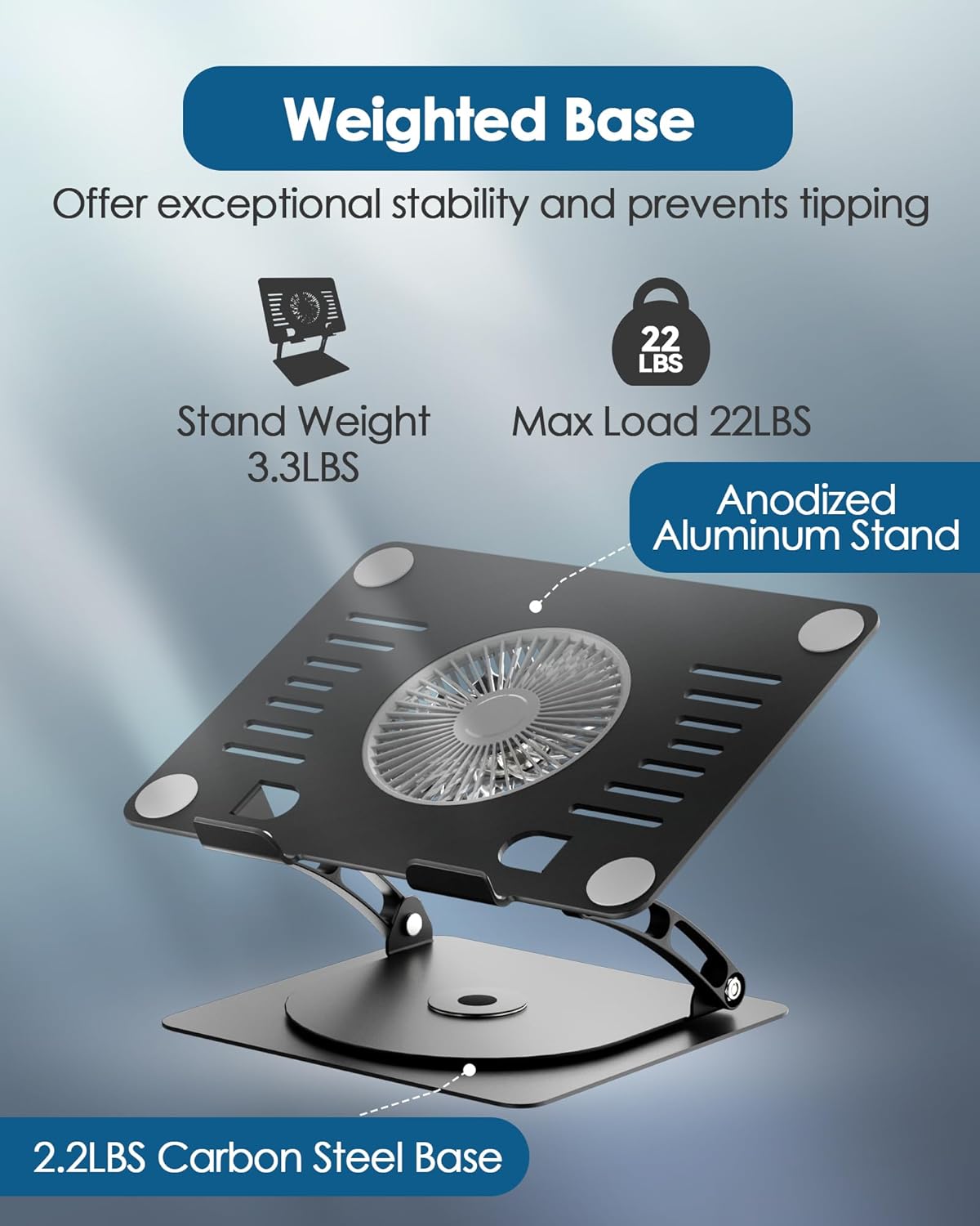 - [Stable with a Weighted Base] This gaming laptop cooling stand is equipped with a 2.2lbs carbon steel base, providing exceptional stability. The aluminum stand, weighing 1.68kg, offers a solid and balanced feel, preventing any tipping or slipping. Note: We suggest using an external keyboard and mouse so you can type efficiently without the laptop keyboard being wobbly.