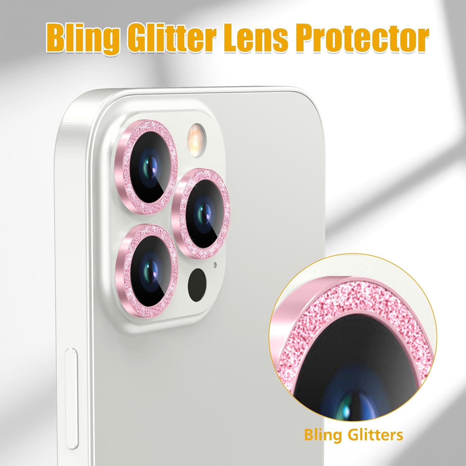 AGVEE 3+3 6 Pack for iPhone 13 Pro 6.1" / 13 Pro Max 6.7" Camera Lens Cover Protector, Bling Diamond & Bling Glitter Metal Ring 9H Tempered HD Glass Camera Cover Protector Film, Bling-Pink