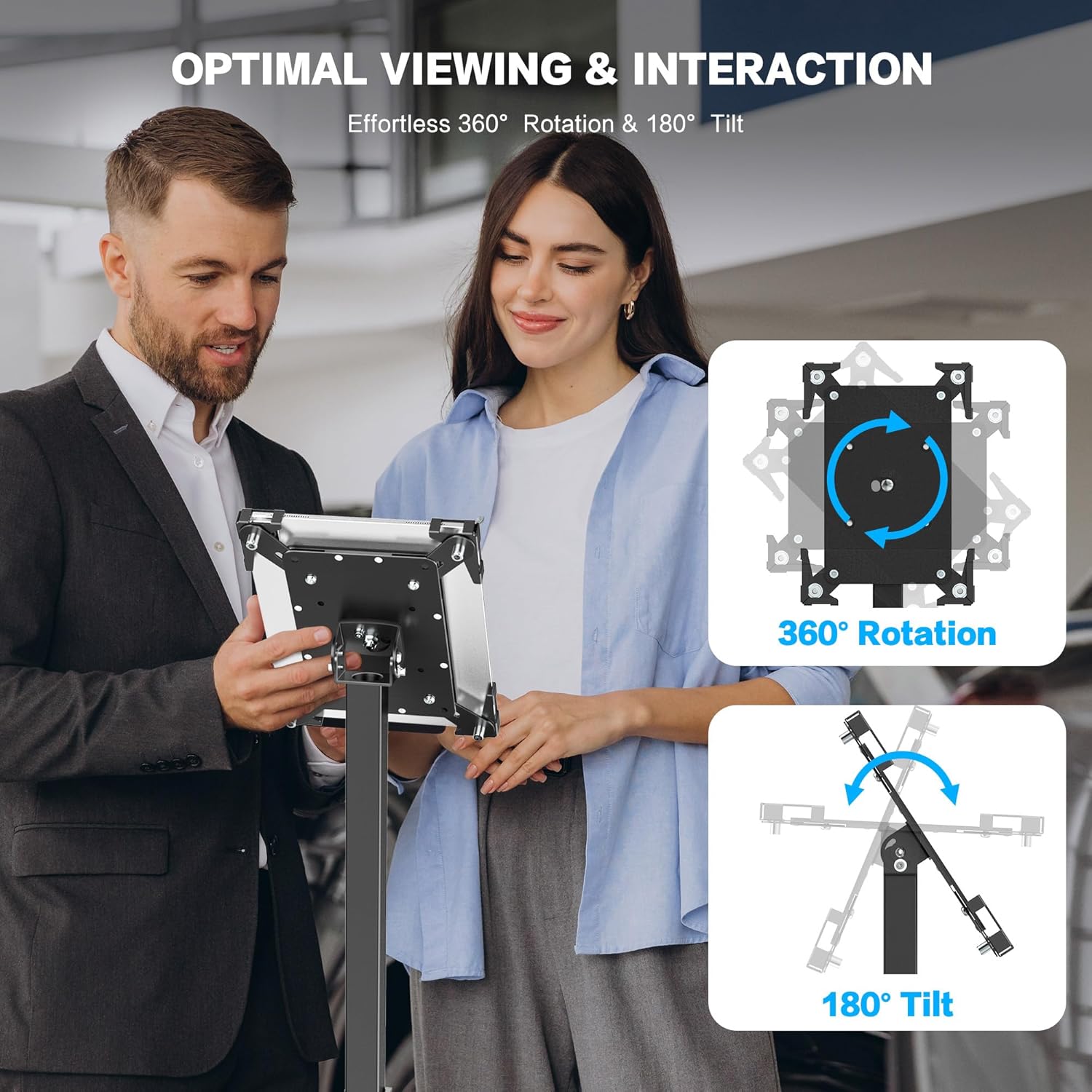 - 360° ROTATION & EASY INTERACTION: Enjoy full 360° rotation and tilt from -90° to 90° for the best viewing and interaction angles. Whether for presentations, kiosk displays, or self-service stations, this tablet stand floor ensures a secure and stable setup, complemented by an iPad POS stand for seamless operations.