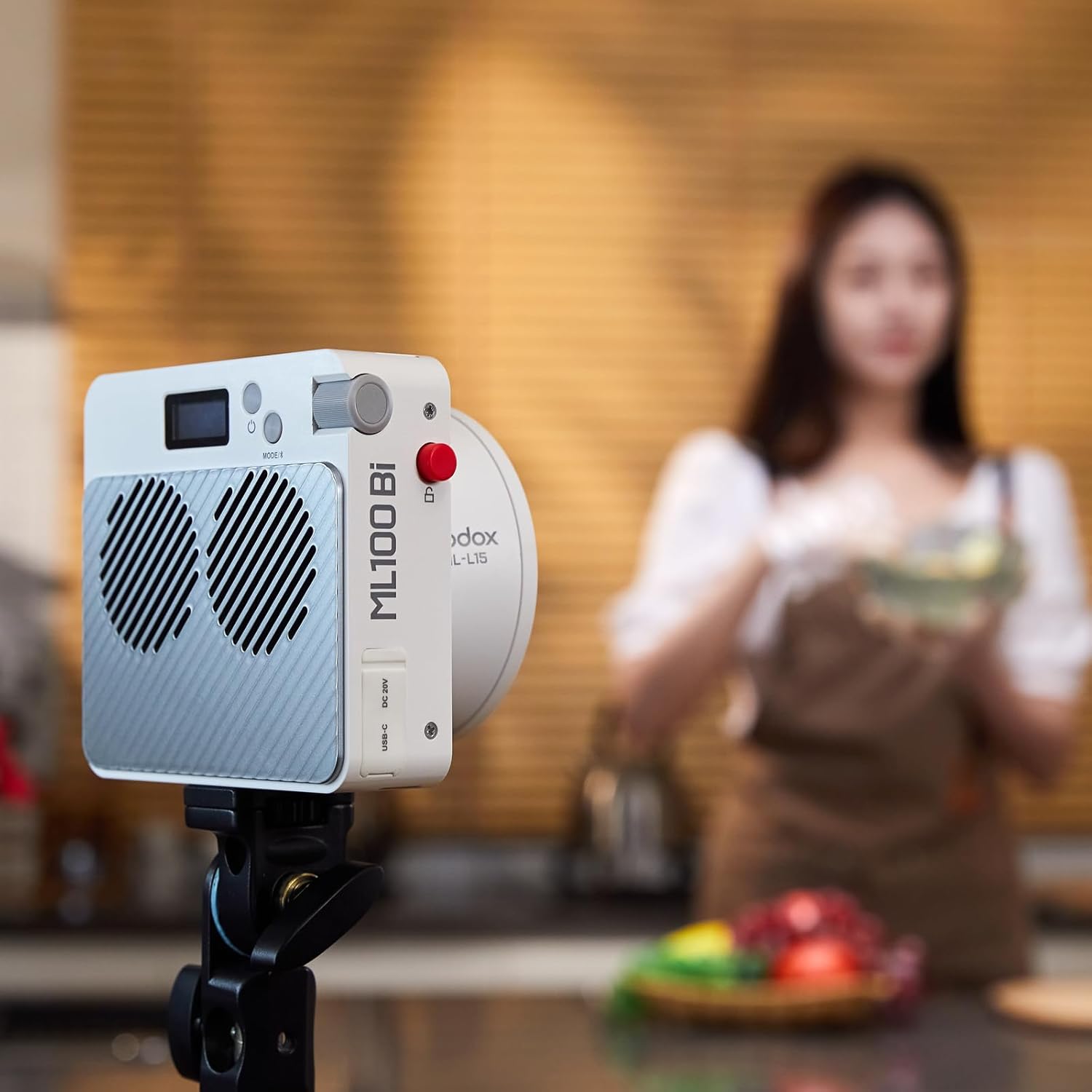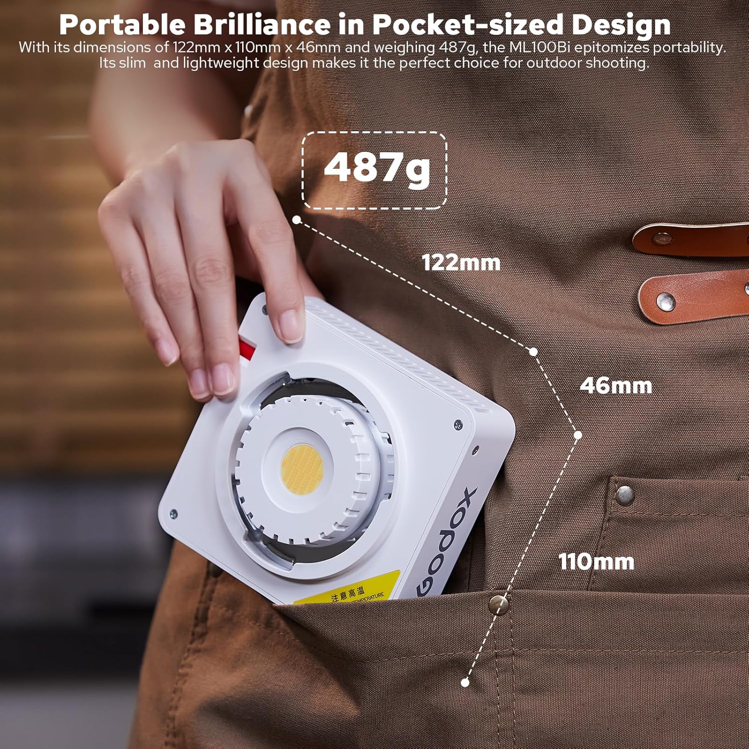 - [POWERFUL AND COMPACT]: 4.8*4.3*1.8 inch, 1 lb, power output 100W, input 120W, Lux 5600K (1M@34300 Lux). The 1lb compact body of Godox ML100Bi provides the flexibility to be used in any environment, you can even slip it into your pocket.