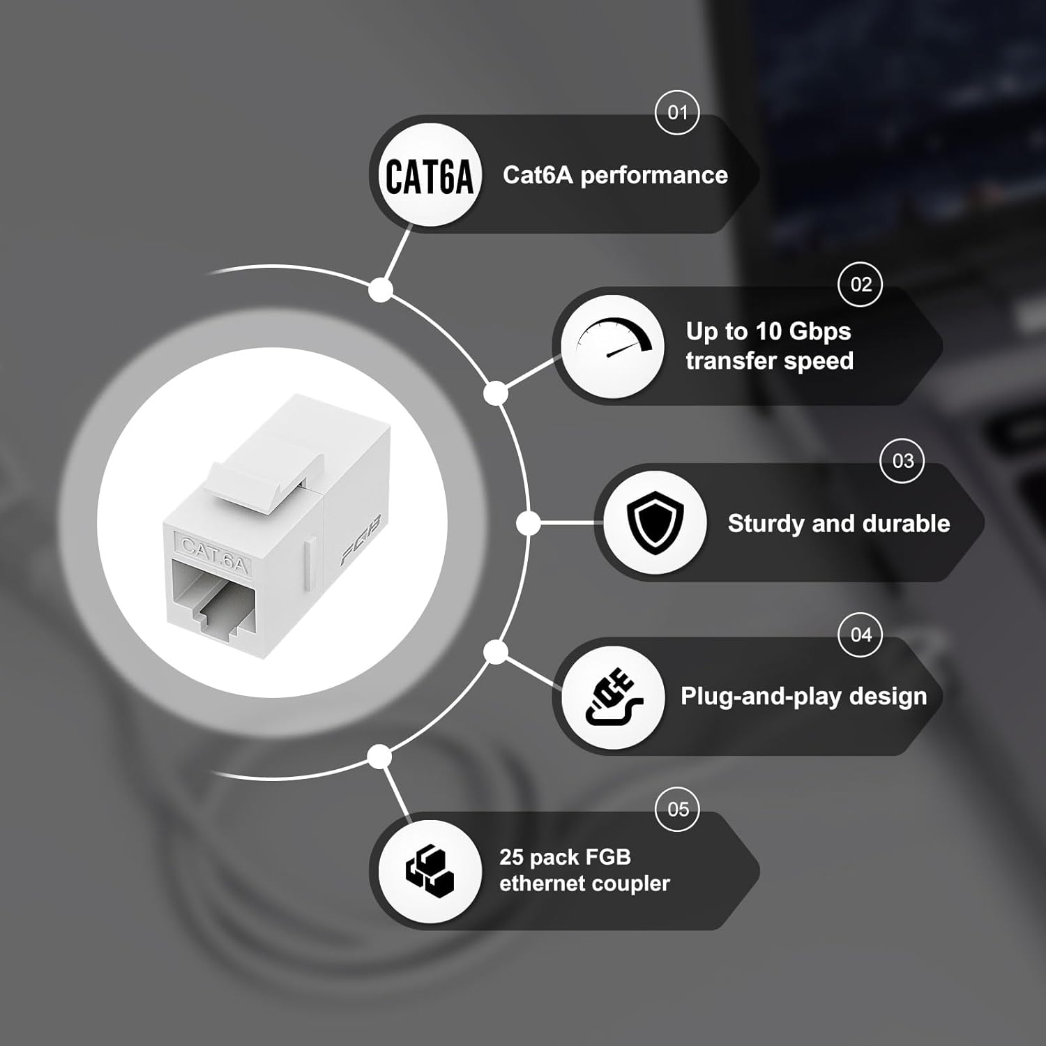 FGB 10 Gbps CAT6A RJ45 Keystone Coupler 25-Pack, Ethernet Keystone Jack, Ethernet Coupler Female to Female UTP for Cat6a/Cat6/Cat5e/Cat5, White