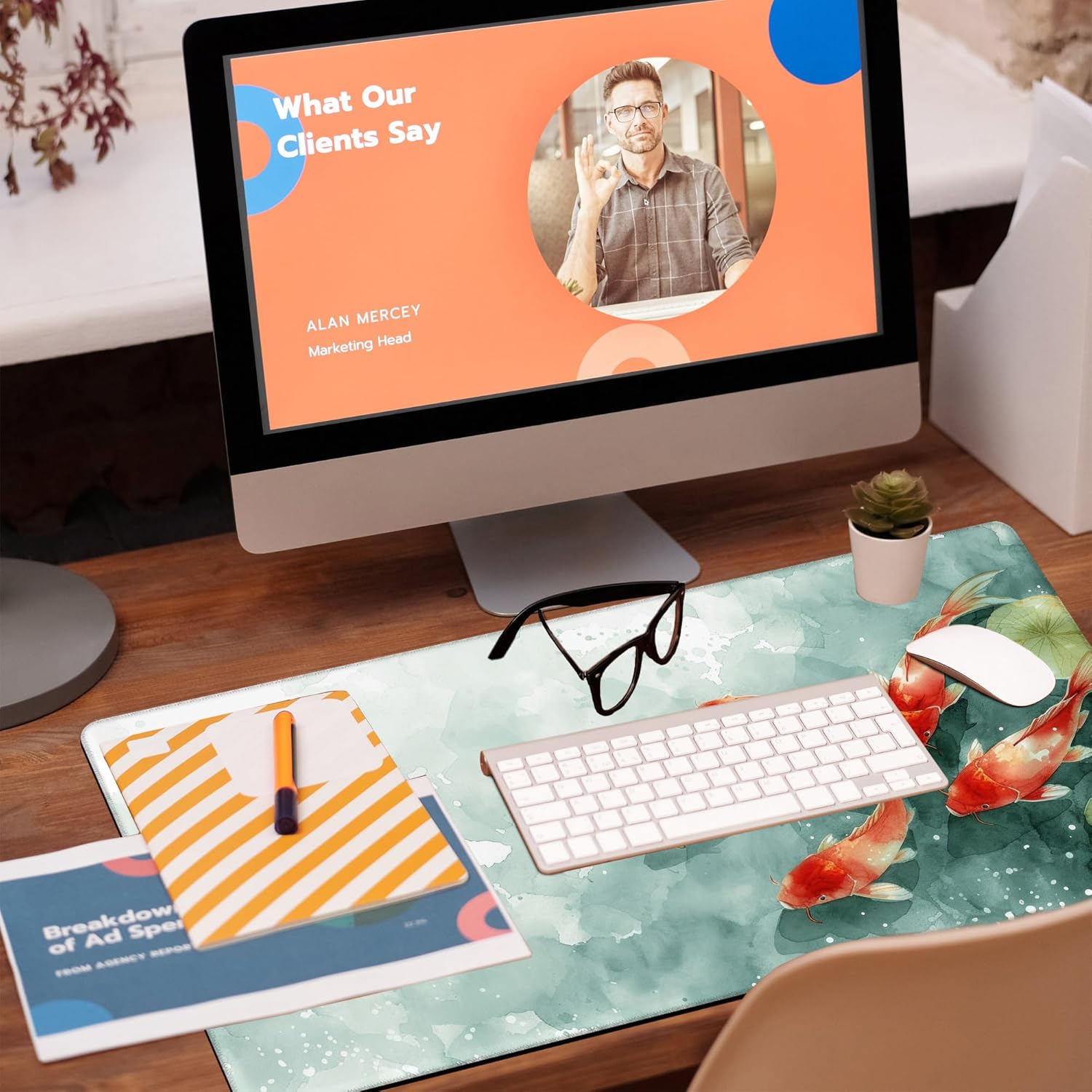 Desk Pad, Watercolor Koi Fish Desk Mat, Koi Fish in Pond Large Gaming Mouse Pad, 31.5"x15.7" Extended Big Computer Keyboard Mouse Pad with Non-Slip Base and Stitched Edge