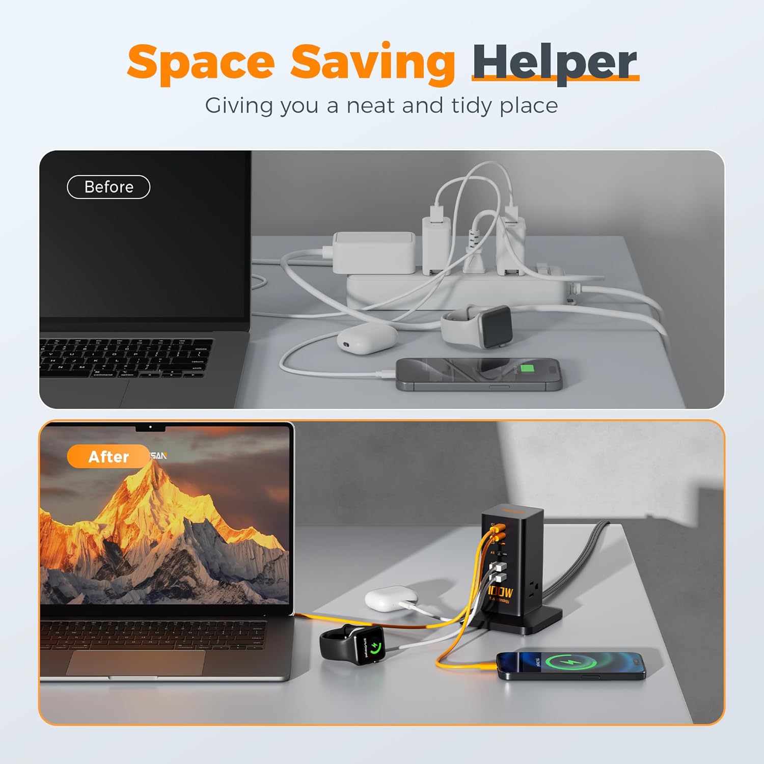Charging Station PD 100W, TESSAN 9-in-1 USB C Power Strip for iPhone 16/15, MacBook, Tablet, Desktop Phone Fast Charger with 3 AC, 3 USB-A Ports, Home Drom Office Accessories