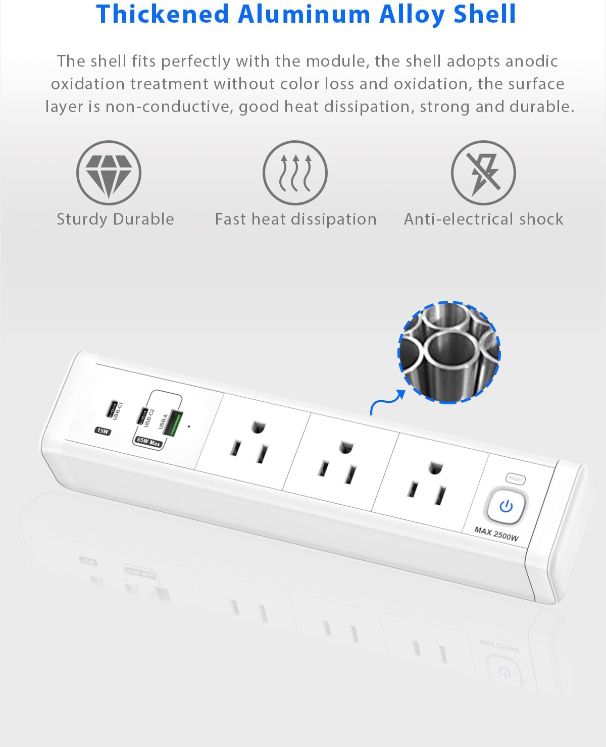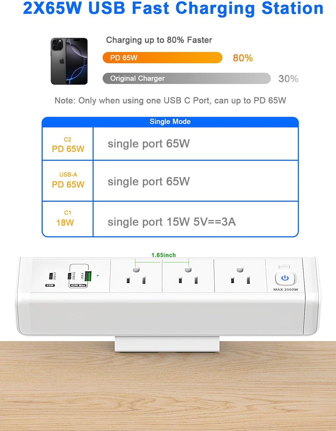 - Desk Outlets AC Output- Power supply for desk edge rated power 1625W/125V/13A, USB ports output: multi-port 65W shared, you can charge laptops, phones or other mobile devices at the same time, suitable for home and office.