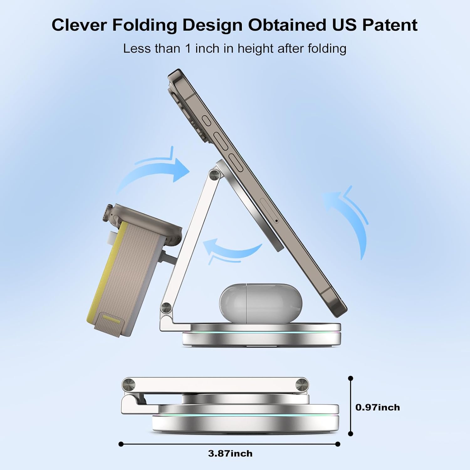 - 3-in-1 Charger: Charge your Apple iPhone, Apple watches and AirPods simultaneously, all while enjoying the versatility of the built-in adjustable stand