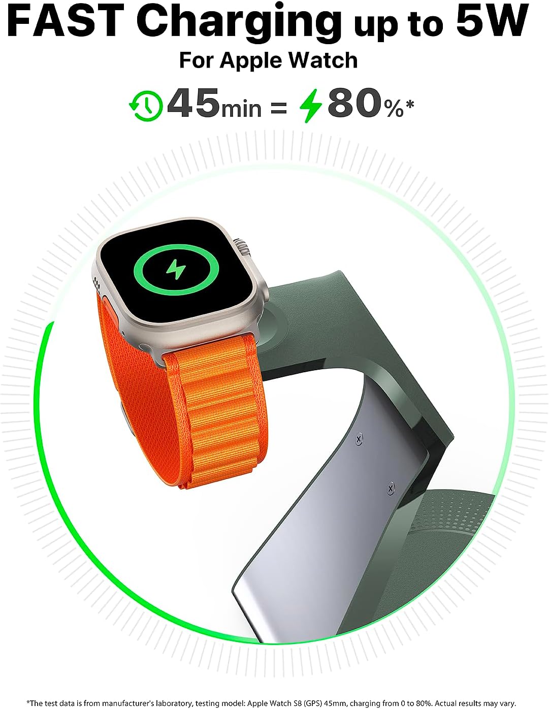 - Fast Charging for Apple Watch: Up to 5W Apple Watch charger. Charge Apple Watch 9 up to 80% in just 45 min—ideal for a fast charge before bed, ensuring it's ready to monitor your sleep all night