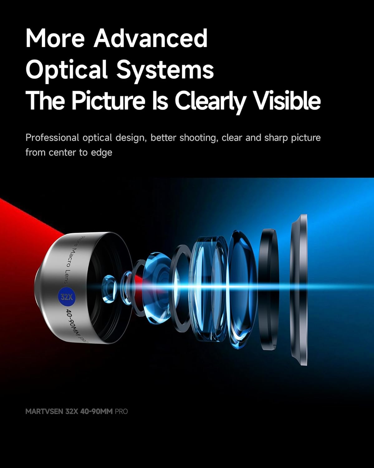 - 【Macro Lens for iPhone, 90MM Focal Length】Featuring the 3.54 Inch / 90mm ultra Focal Length of the MARTVSEN macro lens, no longer annoyed while disturbing the creatures and missing the capture timing.32X magnification, 5 pcs quality optics glass lens, double-sided multi-layer coating, composition and capture over a larger area better. Offer HD view, no distortion, no vignetting, no dark corners. Start to take close-up photos by your cell phone with the macro lens.
