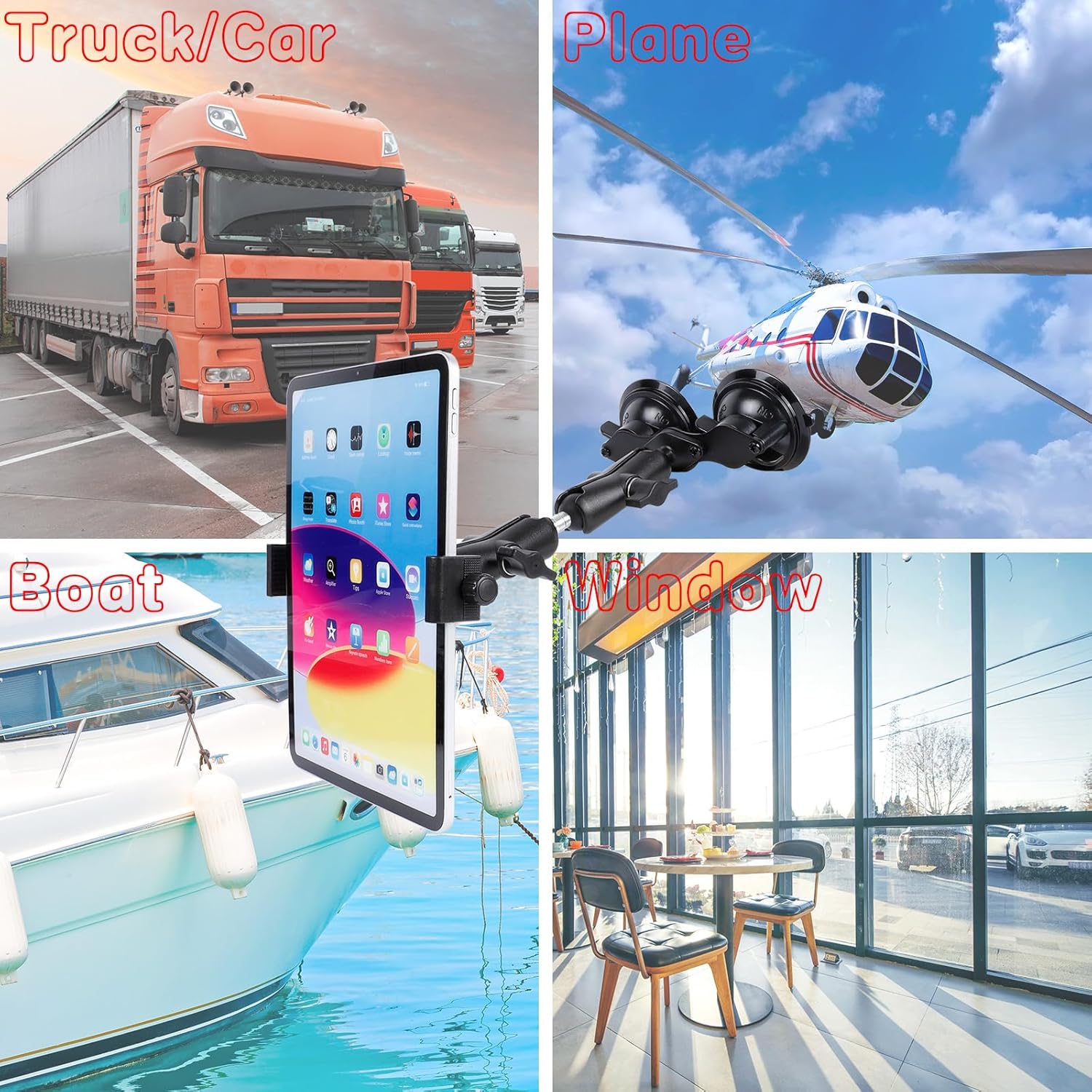Dual Suction Cup Tablet Mount for Truck/Car, 13.4 Inch Aluminum Arm, 360° Adjustable 2-Stage Tablet Stand Holder, Compatible with iPad Pro/Air/Mini, Galaxy Tab and All 6.5-12.9" Tablets