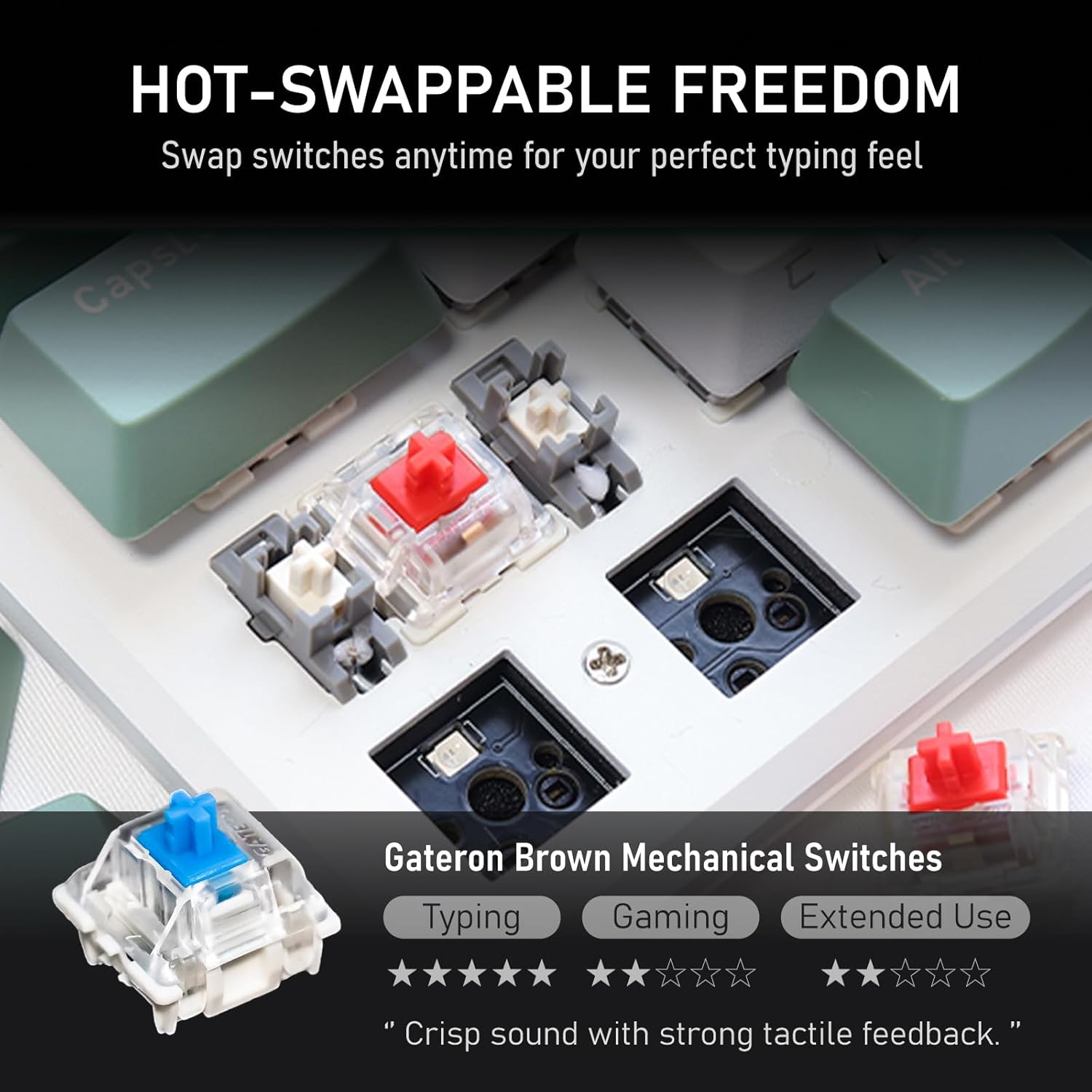 - HOT SWAPPABLE SWITCHES ⚡️ Much more convenient for DIY users, eliminating the need for a soldering iron or other tools to replace the switches you prefer. It saves time and effort. Delivering up to a 50 million click lifespan, N-key rollover, and anti-ghosting powered by an advanced microcontroller.