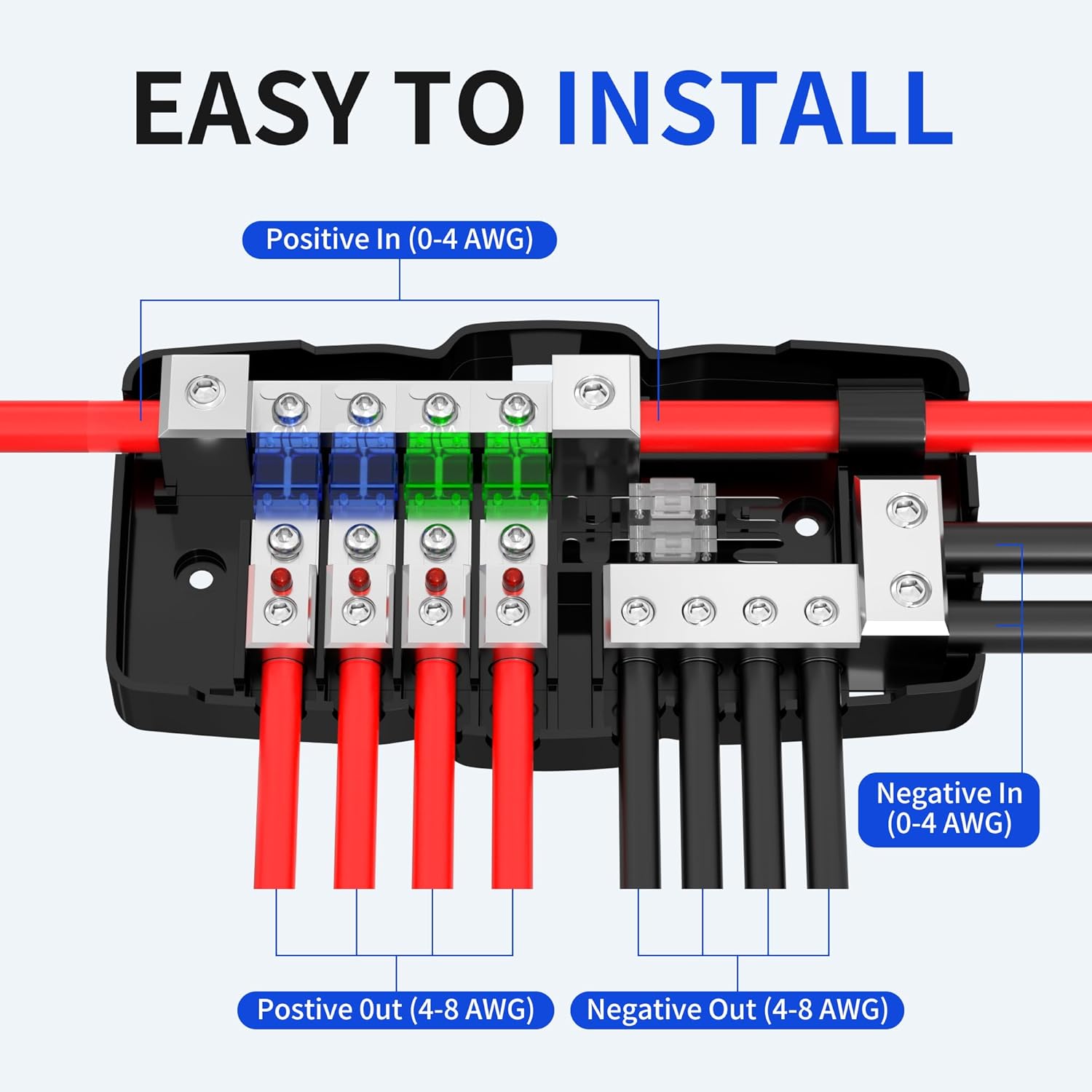 - Furrules: The power distribution block car audio will come with furrules to expand its capacity. Input hole: 0, 2, 4 gauge; Output hole: 4, 6, 8 gauge