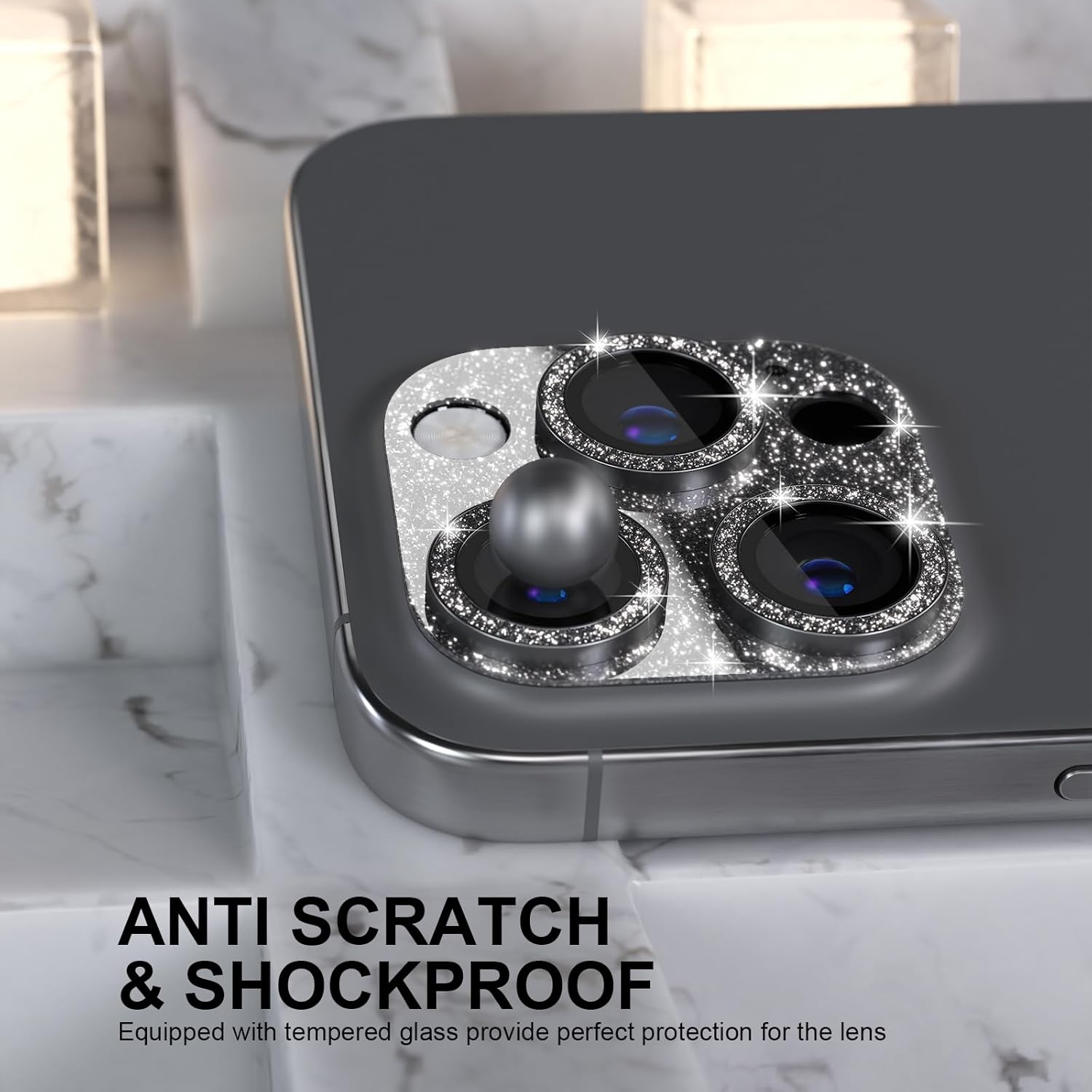 - 5th Gen Upgraded Version: Luxury glitter is inlaid between the high-quality glue layer baseplate and the transparent acrylic cover plate, perfect to avoid the glitter falling off. Match three sparkling metal rings and give your 16 Pro/Pro Max camera lens a diamond-gorgeous appearance, shining in the sun, very eye-catching, and complimentary.