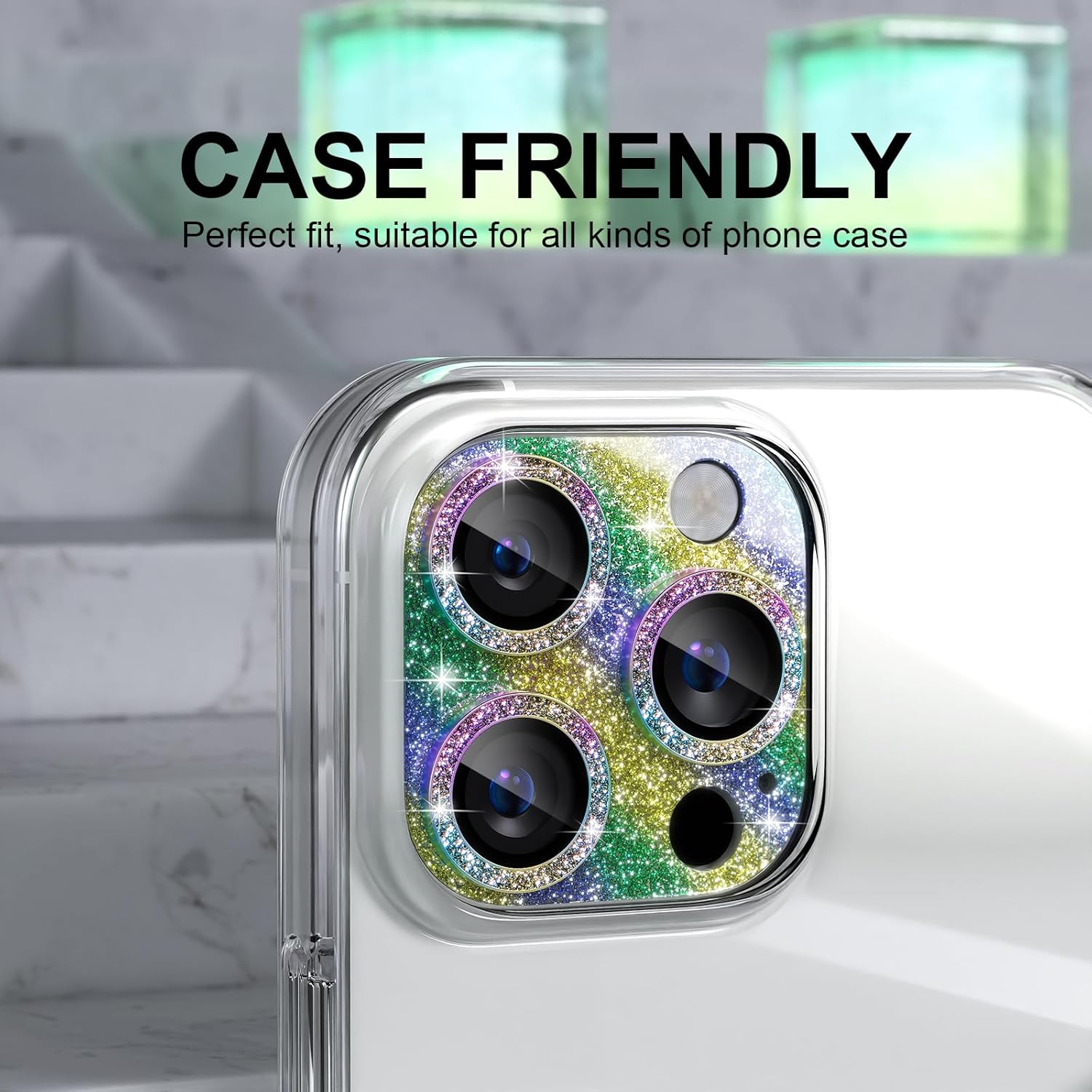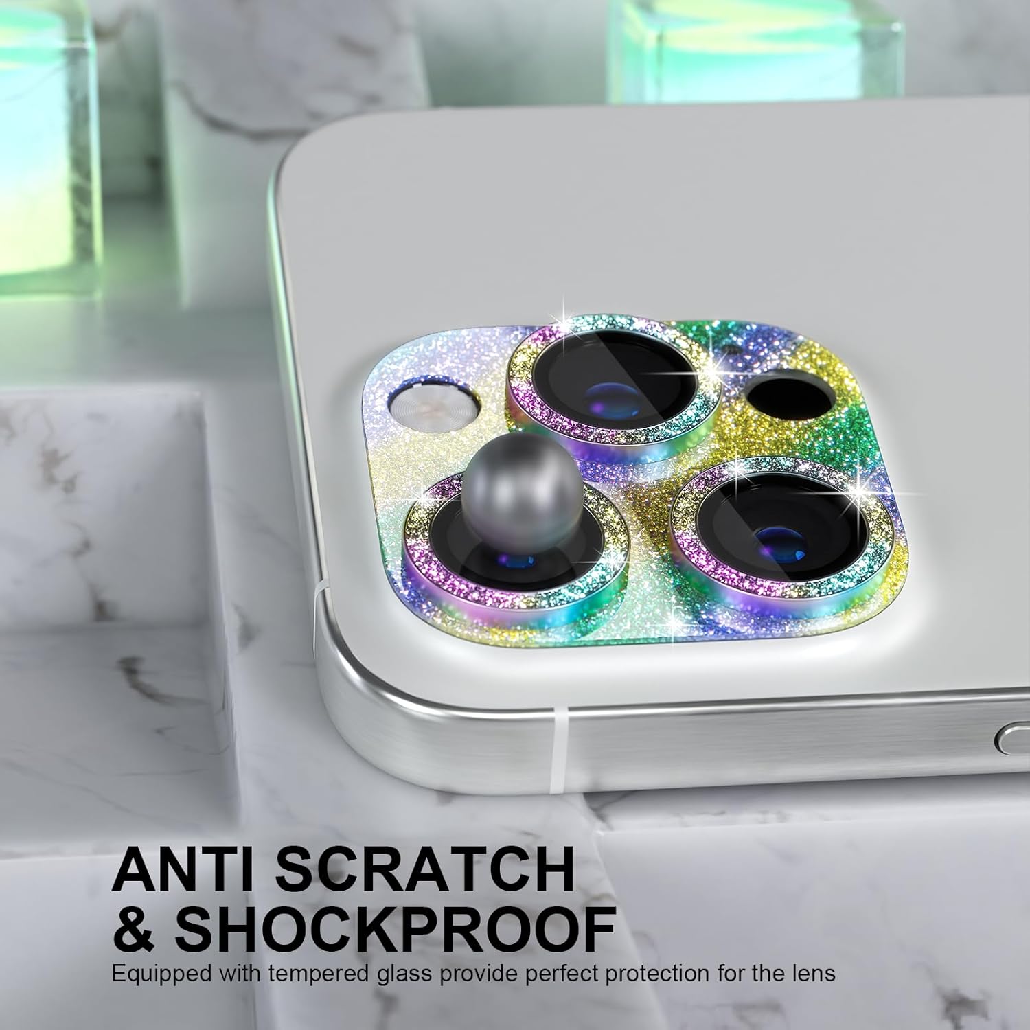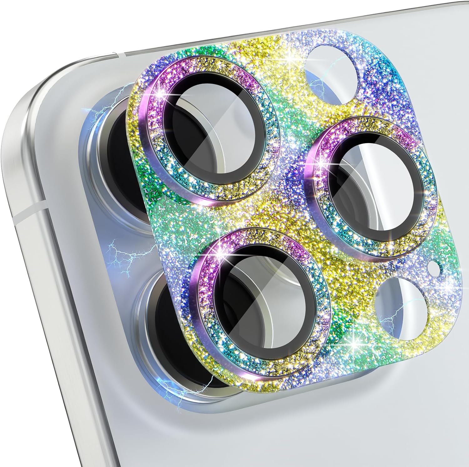 - 5th Gen Upgraded Version: Luxury glitter is inlaid between the high-quality glue layer baseplate and the transparent acrylic cover plate, perfect to avoid the glitter falling off. Match three sparkling metal rings and give your 16 Pro/Pro Max camera lens a diamond-gorgeous appearance, shining in the sun, very eye-catching, and complimentary.