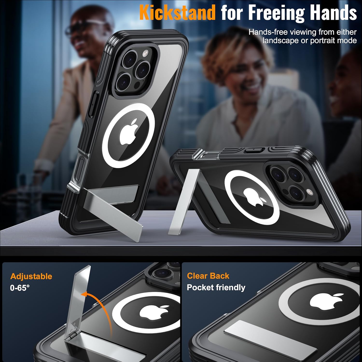 - 【Free Your Hands, Enjoy Every Moment】This iPhone 16 Pro magnetic phone case with metal kickstand has been rigorously tested by folding and opening several times, the kickstand can be infinitely adjusted from 0-75° viewing angle and will not interfere with the use of the magnetic function. With this iPhone 16 Pro phone stand, you can free your hands and let your phone switch between portrait and landscape while Face-Time with friends or watching your favorite show!