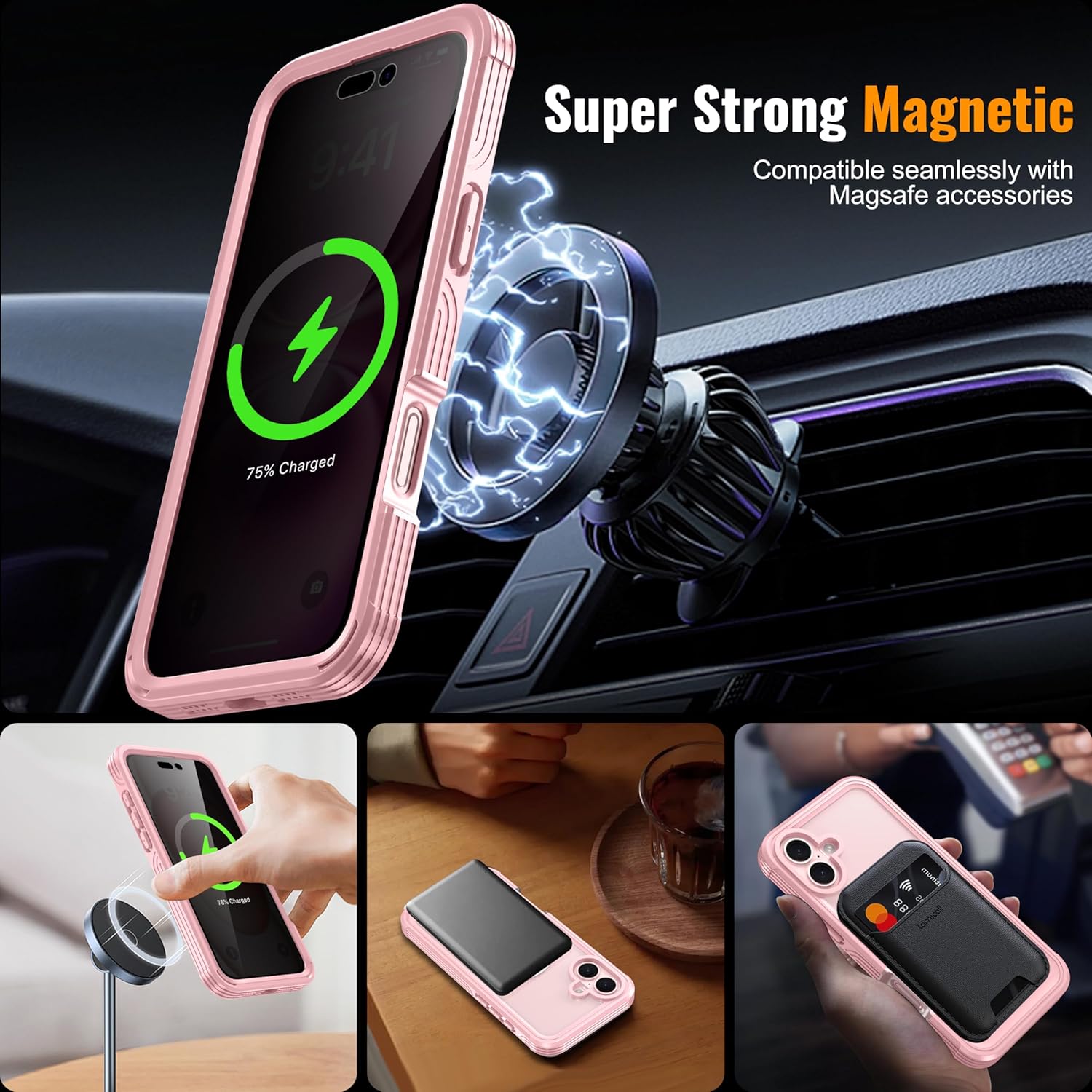 360° Protection Magnetic for iPhone 16 Case Built-in 9H Privacy Screen Protector & Metal Stand[Fit for Magsafe][Anti-Spy][Lens Protector] Heavy Duty Shockproof Phone Case for iPhone 16(Pink)