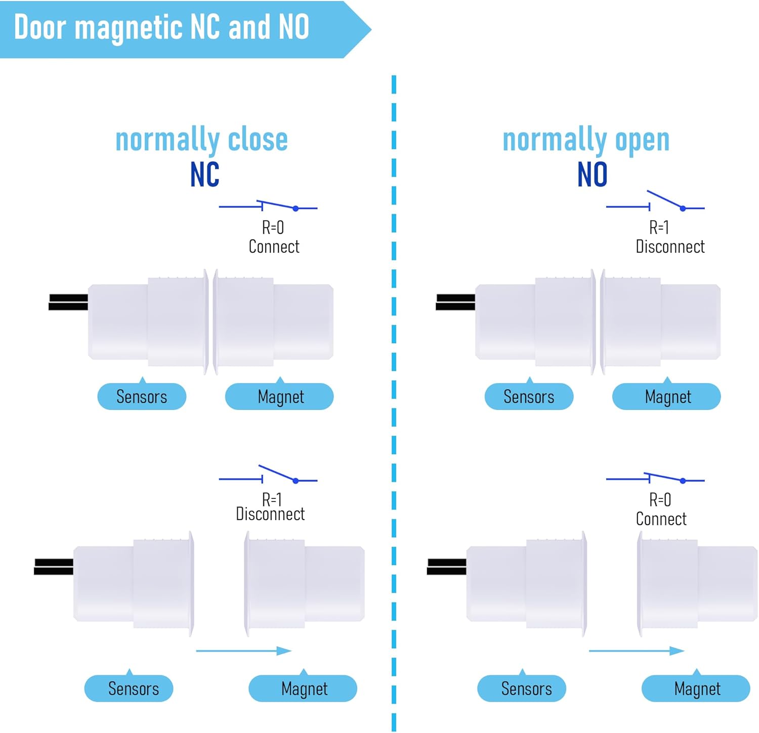- 【Normally Closed (NC)】Normally closed type with 2 wires. When the magnet together, the circuit is conductive( light on ); the circuit is not conductive ( light off ) if the magnet separates.