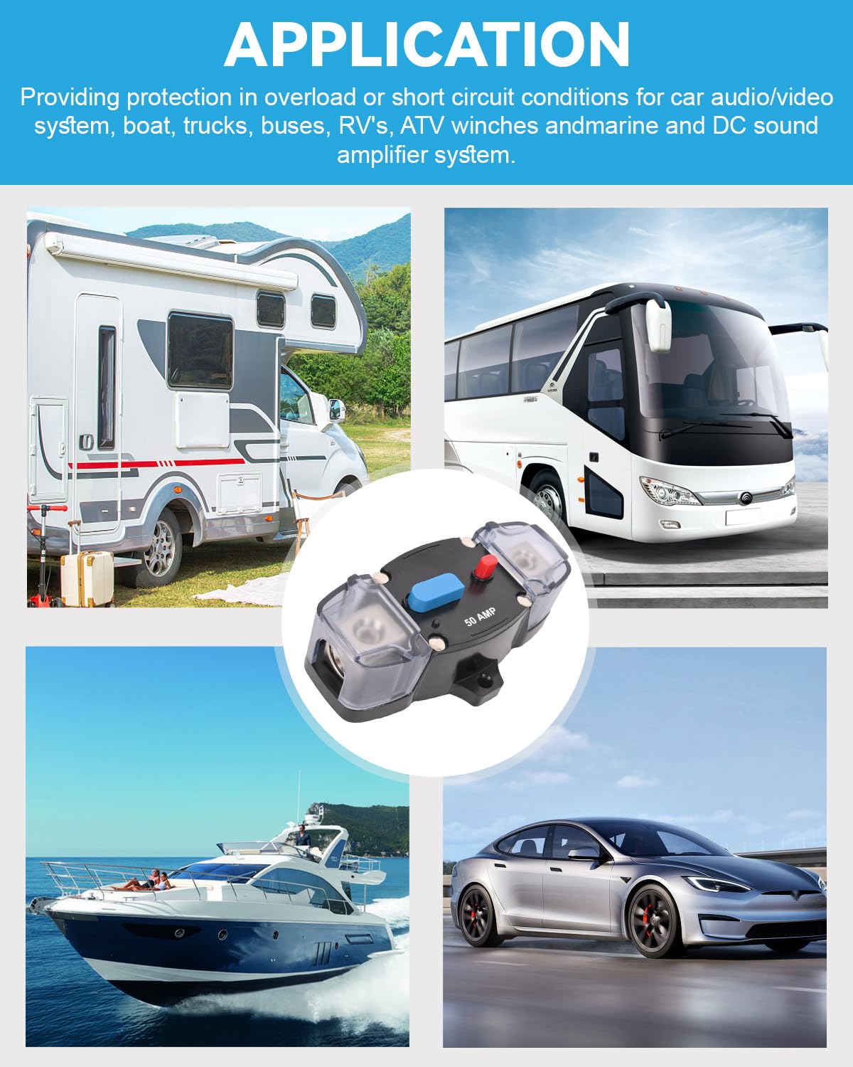 - APPLICATIONS: Ideal for protecting against overloads and short circuits in high-current applications such as cars, boats, RVs, caravans, tractors, audio systems, horns, dual-battery isolators, and winches. This high amp 300a 12v breaker fuse is perfect for use in automotive, marine, and auxiliary DC electrical systems, providing a versatile solution for Automotive Circuit Breaker and Marine Circuit Breaker needs