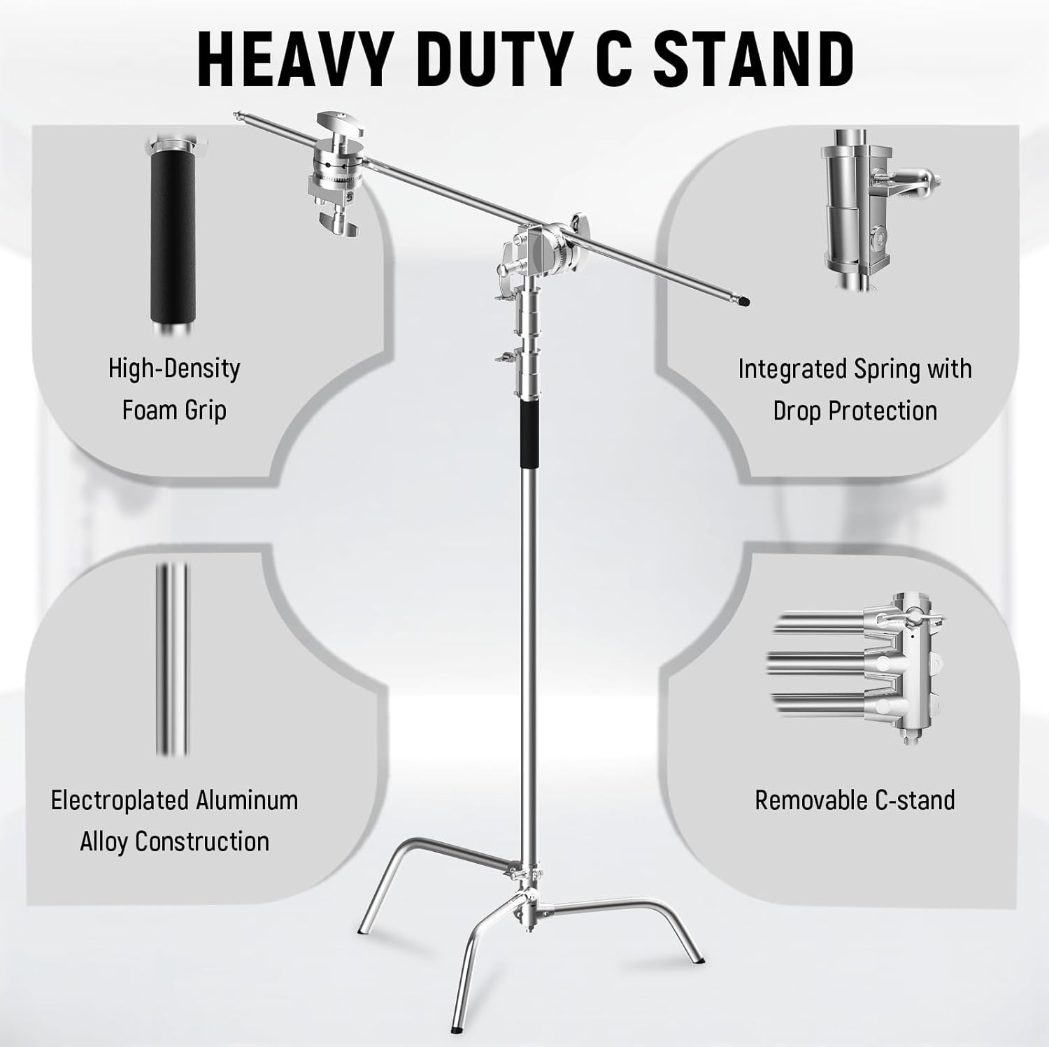 - Multi-Purpose C Stand: Professional photography light stand with detachable boom arm system. Ideal for studio lighting, backdrop support, and equipment mounting with maximum versatility.