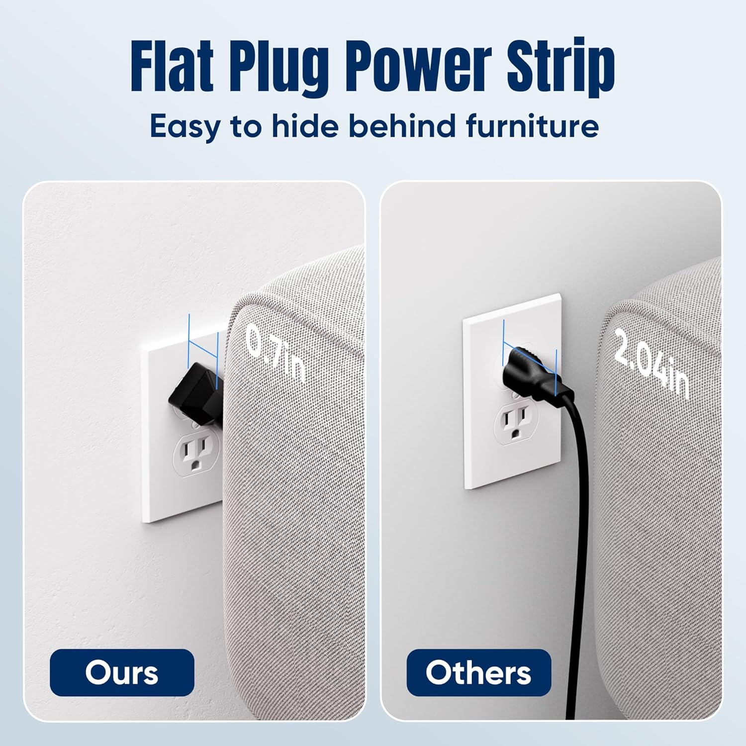 - 🏠【Space Saving Design】- Experience the ultimate in space efficiency with JouleLoom 6FT surge protector's slim flat plug, measuring a mere 0.7 inches thick. Unlike traditional plugs, its unique 45-degree right-angle design ensures it won't obstruct neighboring outlets. Plus, with two multi-directional hanging holes, you can easily mount it horizontally or vertically on workstations, walls, counters, bedrooms, optimizing your space like never before.
